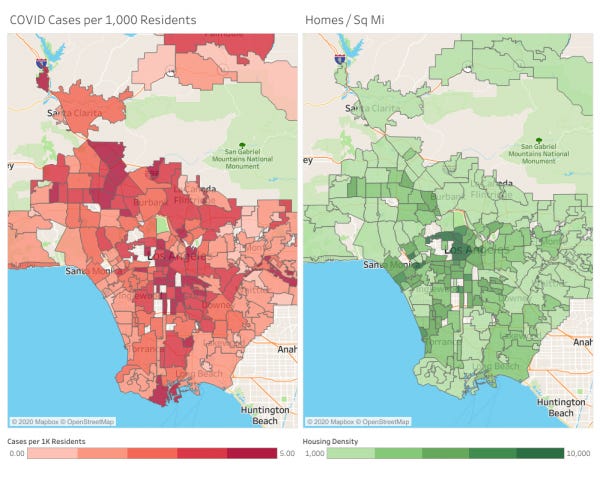But neighborhoods in South LA and the San Fernando Valley are epicenters of the pandemic, despite not being very dense. And some relatively housing-dense areas, like Santa Monica and Venice, have low COVID-19 case rates. It’s a more complicated relationship than “more housing equals more COVID”.