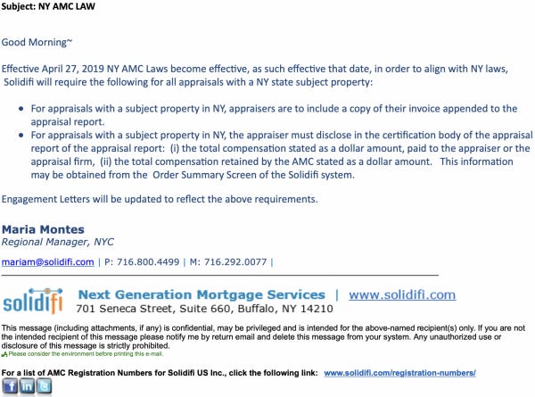 – I’ve been told by several colleagues that they’ve heard one of the main AMC concerns is whether New York interpreted the original law correctly to arrive at this form of law regarding AMCs. From my perspective, it’s like not buying a house because one of the gutters is missing a few screws to hold it in place. The criticism seems like a weird attempt at fogging since this law is protective of USPAP and the public trust, something that has been forgotten in the attempt to “modernize” the appraisal industry. But I’m no lawyer so I’ll look for clarification on their logic. But consider this: