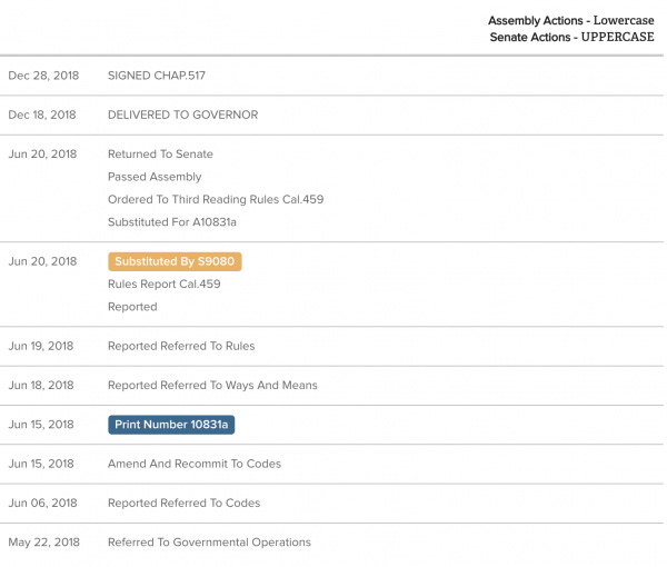 A similar proposal was introduced by the New York Department of State in 2015. Senate Bill S9080 was introduced two years ago during the 2017-2018 legislative session, signed into law on December 27, 2018 and became effective today. The voting was unanimous in favor by the rules committee of both houses and the body of both houses.