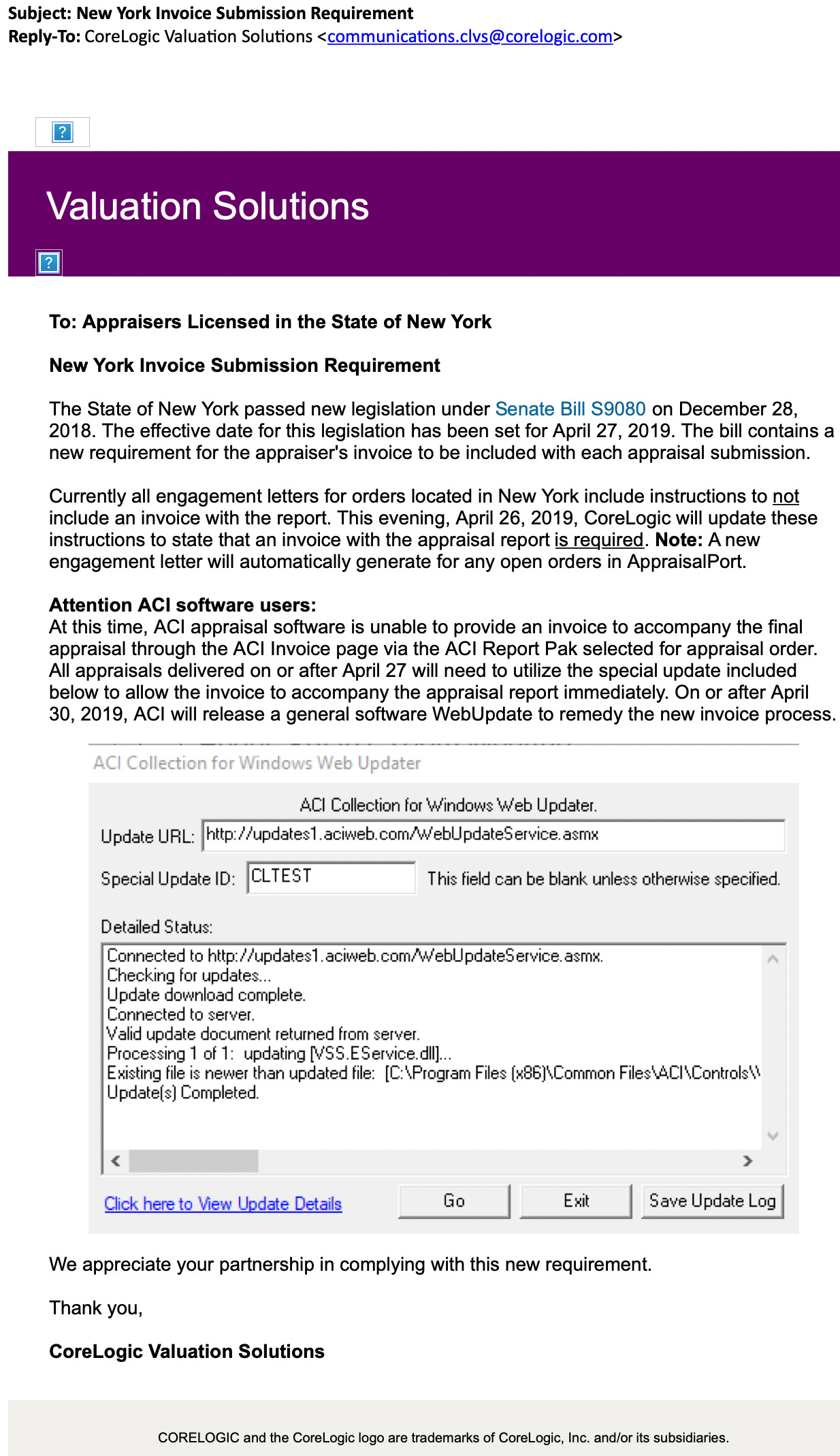 – A concern shared with me by a friend and appraiser colleague in Virginia was that most of the large AMC platforms, such as CoreLogic, Appraisal Port and Xome, use a portal that strips the report and the appraiser’s invoice is one of the forms that does not get uploaded (because they don’t want the consumer (i.e. mortgage applicant) to see how much the actual cost goes to the person providing a value opinion of their home. If AMCs continue this practice in New York State and are caught, they will lose their ability to do business in the state. They can risk it, but the stakes are high. There is always a concern that oversight of this will be lost in the shuffle so it is imperative that appraisers keep the pressure on.