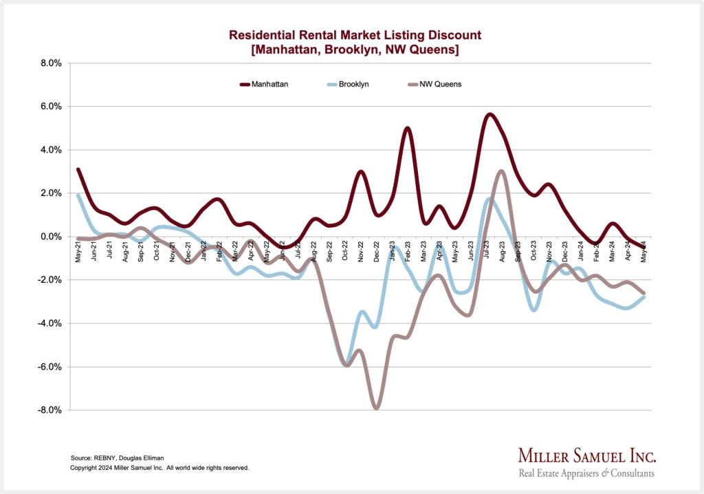 In the following chart of listing discounts by borough, it is apparent that the rental market in the outer boroughs of New York City is much tighter than in Manhattan, showing listing “premiums” (negative listing discounts) for much of the past three years (overall rents are higher than overall asking prices). Manhattan’s listing discount has been consistently higher but showed a premium in the past few months.