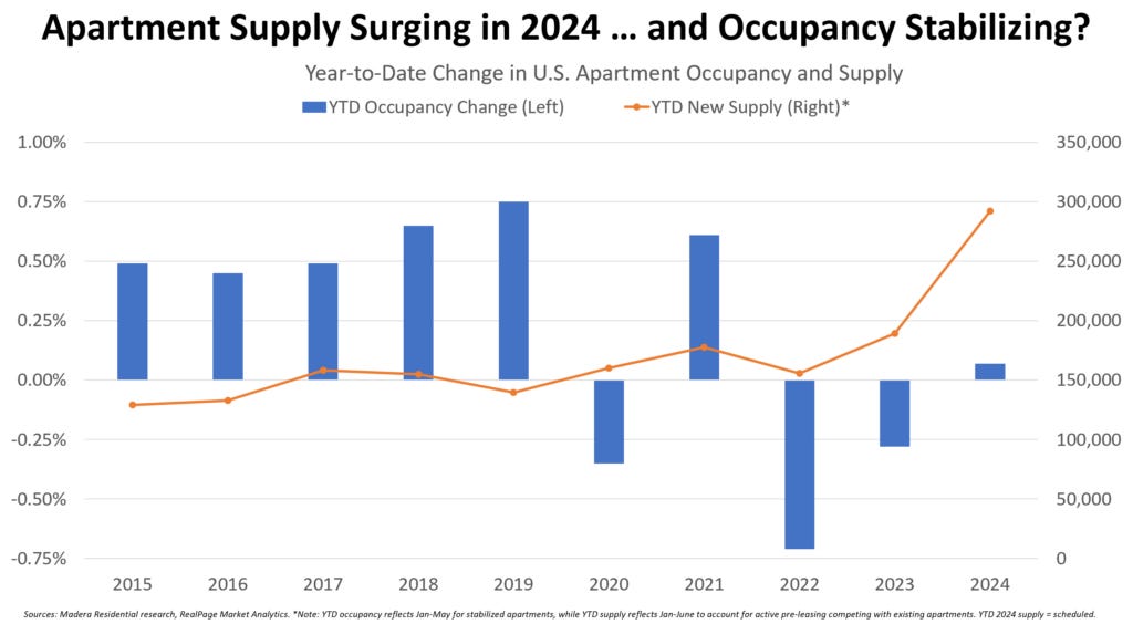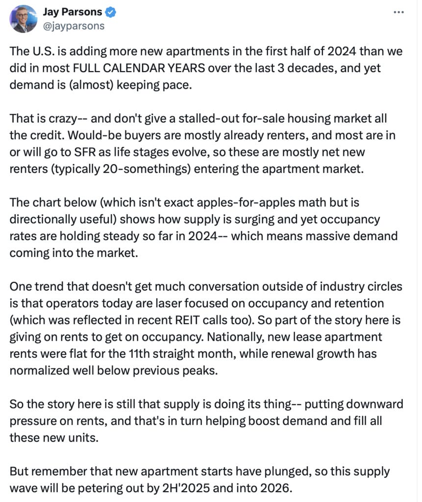 Construction of multi-family (mostly rental) units is surging as occupancy is leveling off. Rental housing economist Jay Parsons is a good follow on Twitter. Here is what he says about the rental market. It’s not all about the stalled purchase market because of high rates. Significant demand from young millennials and gen-zs is keeping pricing elevated but stable as an offset to the overbuilding. Translation: Lots of supply coming in is being offset by increasing demand.