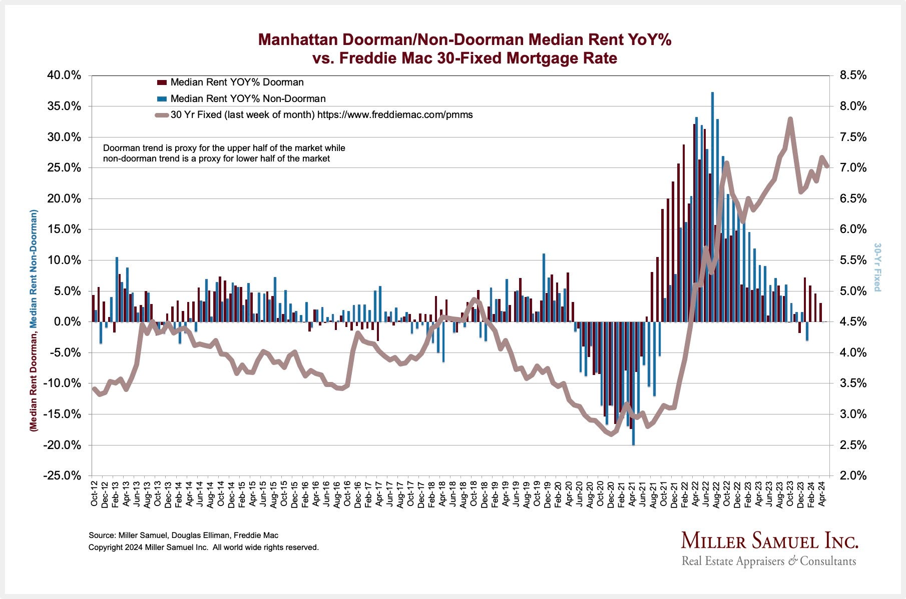 In Manhattan, rental transactions in doorman buildings account for about half of total rental activity and serve as a proxy for the top half of the market by price. The other half of the rentals are in non-doorman buildings. When compared to the prevailing mortgage rate, both types of rents rise when mortgage rates rise and conversely, rents fall when mortgage rates fall. The doorman and non-doorman proxies for high-end and low-end are not mutually exclusive, having a ton of overlap, but these rental types split rental transactions literally in half.