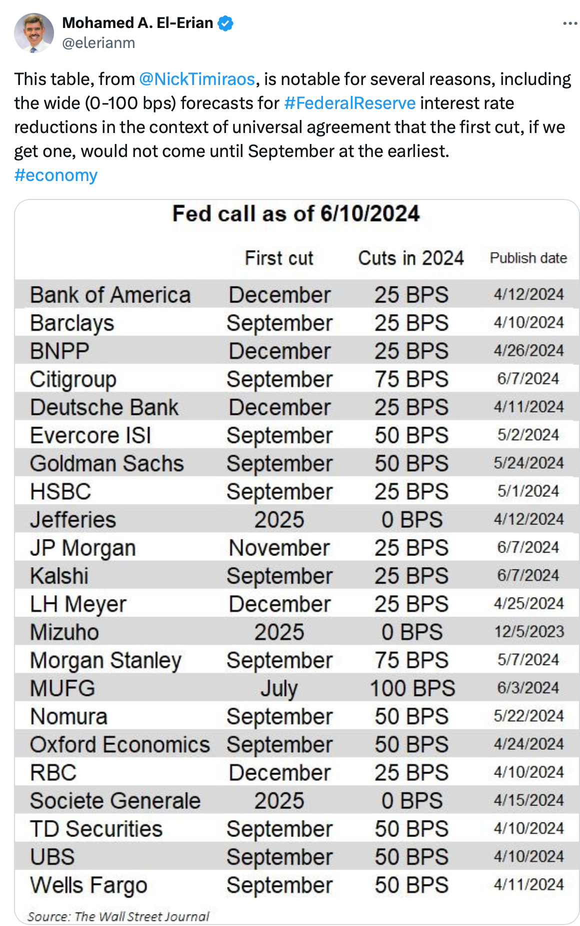 As the following table indicates, most economists seem to think that time will be September. Someone pointed out to me yesterday that these are probably the same economists who called for a rate cut last April and June. The economy still shows strength with 4% unemployment and higher wage gains than pre-pandemic so it’s hard to think about a rate cut at the moment.