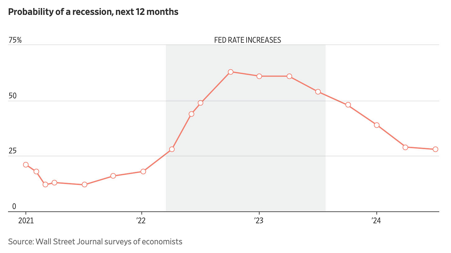 Consensus by economists on things like Fed rate cuts often seems wrong (if that’s not my cognitive dissonance kicking in). Most economists were wrong at the beginning of the year, predicting 5-6 rate cuts in 2024 after the Fed predicted at least 3. And every month, those forecasts were pulled back as the economy showed too much strength for a cut. One could argue the economists who are selected for these surveys are some of the smartest people in the business. I’m sure they are well-informed and very forward-looking.