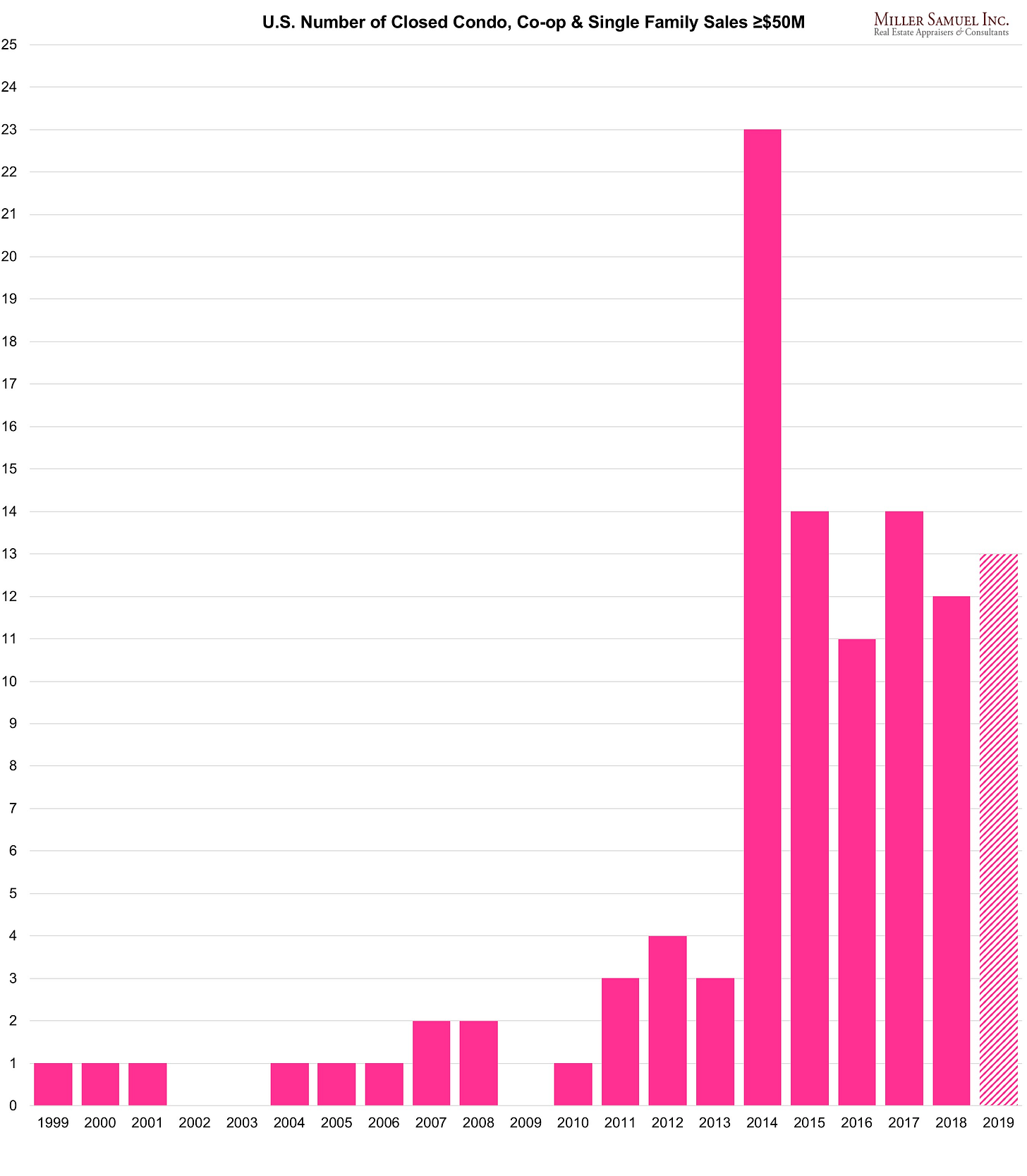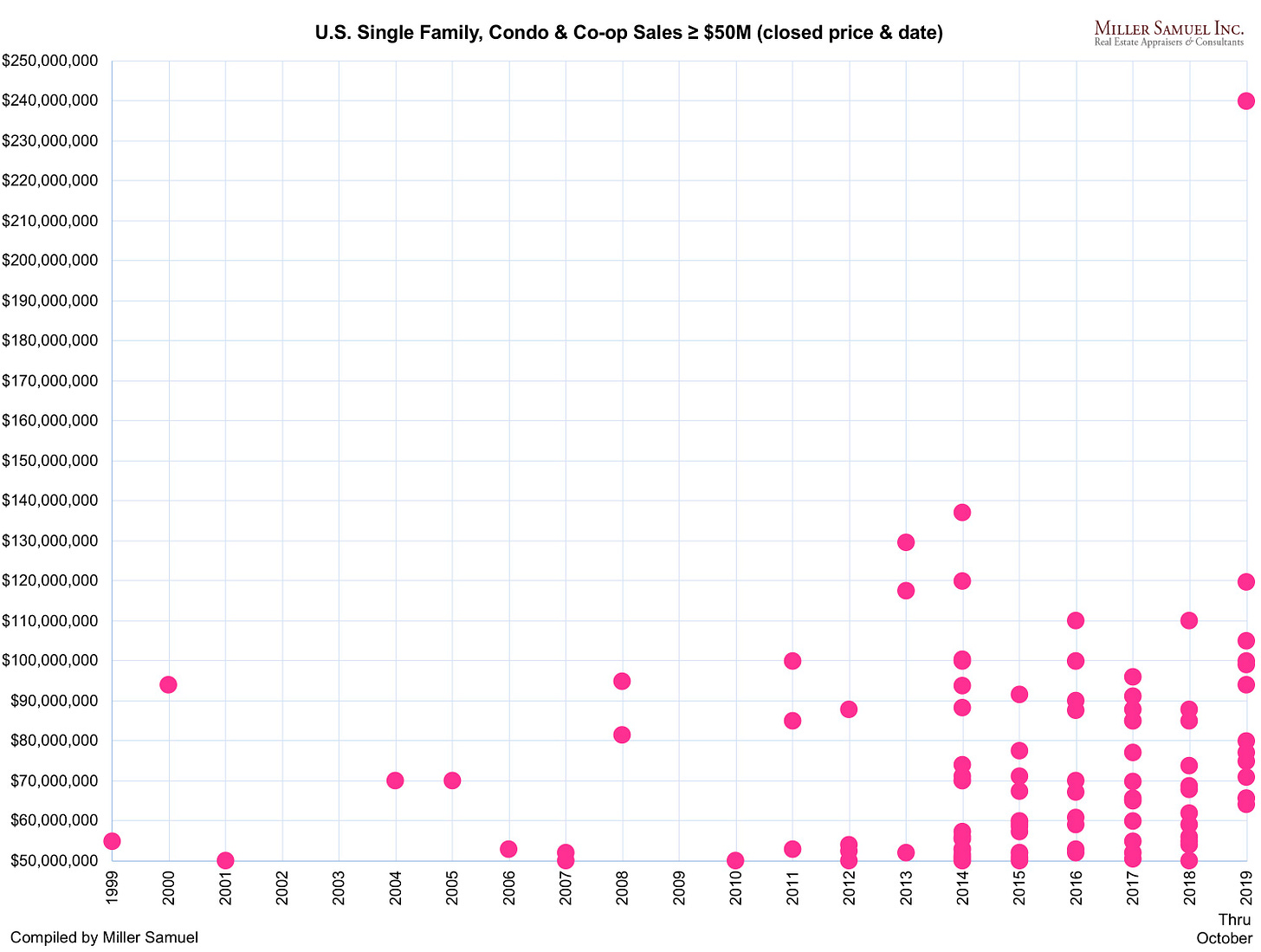 Back in 2014, I started to notice a pickup in press releases for $100+ million listings in the U.S. and so I began to collect closed residential sales at or above the $50 million threshold. On one hand, it is amazing how many sales there have been, but perhaps what is not so amazing, is how few there have been in the context of expectations that existed in 2014.