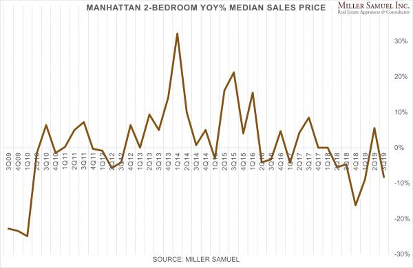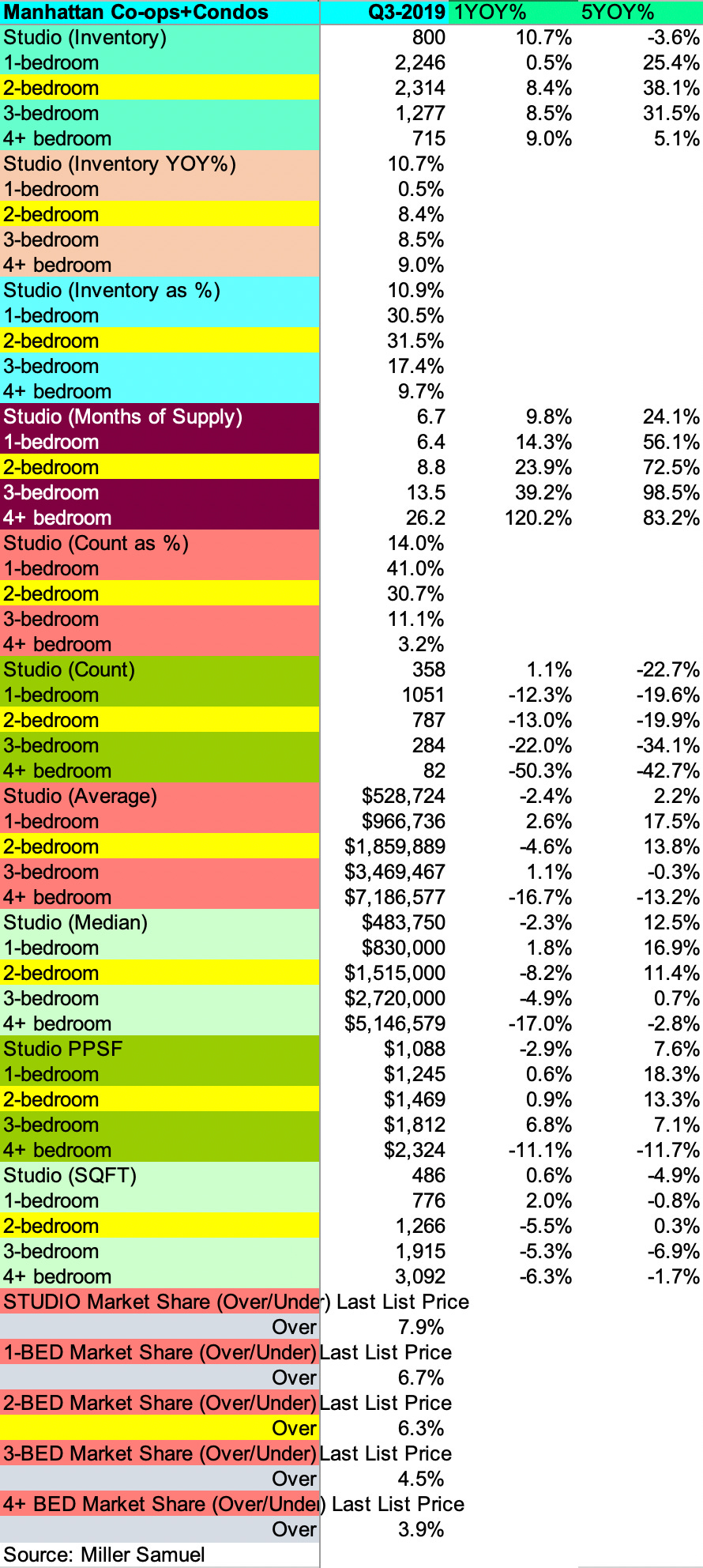 Here is a raw presentation of Manhattan co-ops/condos in the 3Q19 as compared to a year and 5 years ago (2-beds highlighted in yellow).