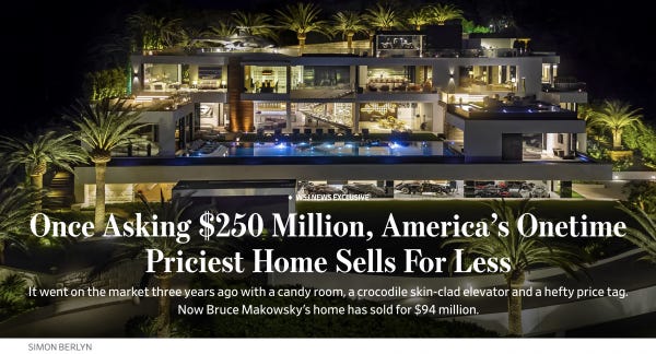 The most recent victim of reality was the “Billionaire” spec home in Los Angeles that was priced at $250 million. The Wall Street Journal broke the story a week ago with an epic picture of the home in Once Asking $250 Million, America’s Onetime Priciest Home Sells For Less. The Real Deal LA followed up with a great dive into the story: “Billionaire” mansion sale is the latest fail in “ego pricing:” brokers.