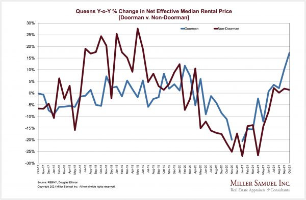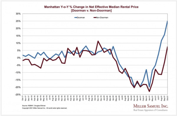 – Median rent for doorman buildings surged by the highest rate in at least nine years as non-doorman median rent increased annually for the first time in eighteen months
