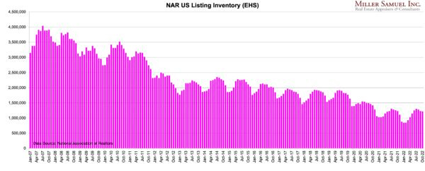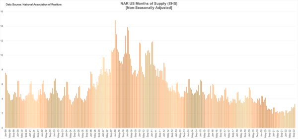 The problem with this NAR chart is it doesn’t show the context of the collapse in listing inventory. There are 3.3 months versus six months as their stated norm. In other words, even with the rise in supply from 2.4 months to 3.3 months over the past year, listing inventory remains at half of the normal levels.