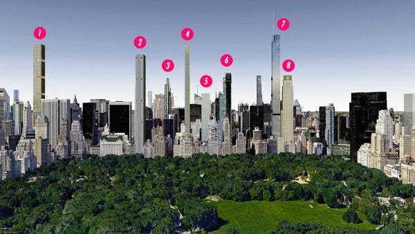 The next rendering looks south from Central Park. The first rendering is labeled “4” in the image below. While building number 2 has been canceled/suspended, you can see how much the skyline has changed over the past decade.