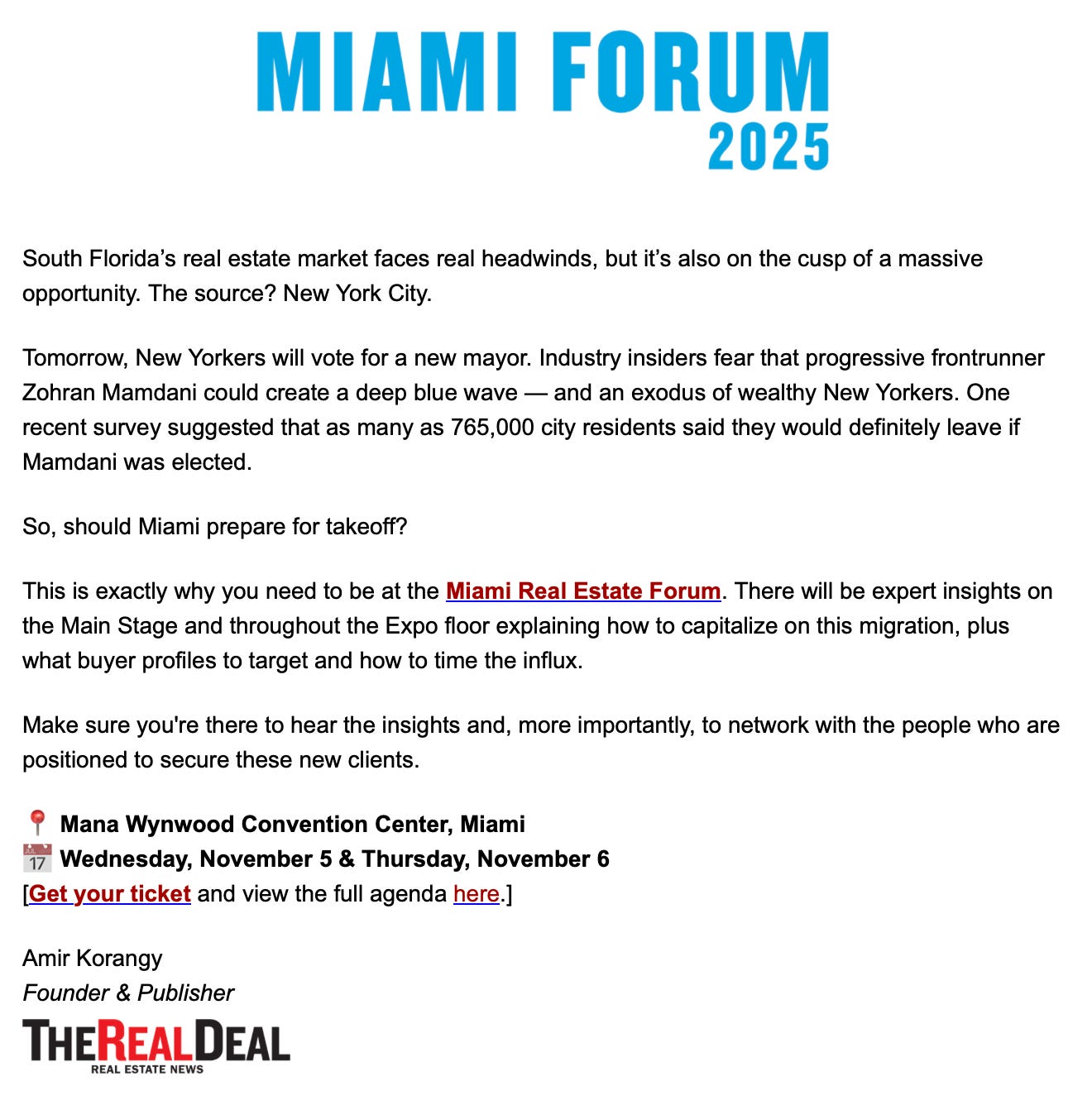I appreciate, subscribe to, and respect The Real Deal and its staff, which has always been an essential go-to publication in the real estate industry during my career in NYC. I was surprised to see the “fleeing the city” narrative appear in a recent event Florida marketing effort. Of course, marketing is different than journalism.