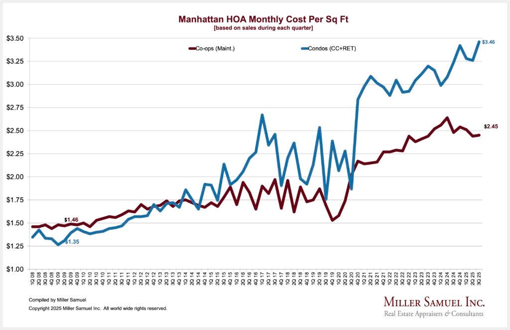 The monthly maintenance per square foot of an apartment in The Pierre we appraised last year at was $6.05 per square foot, about three times the Manhattan average of $2.45 per square foot.