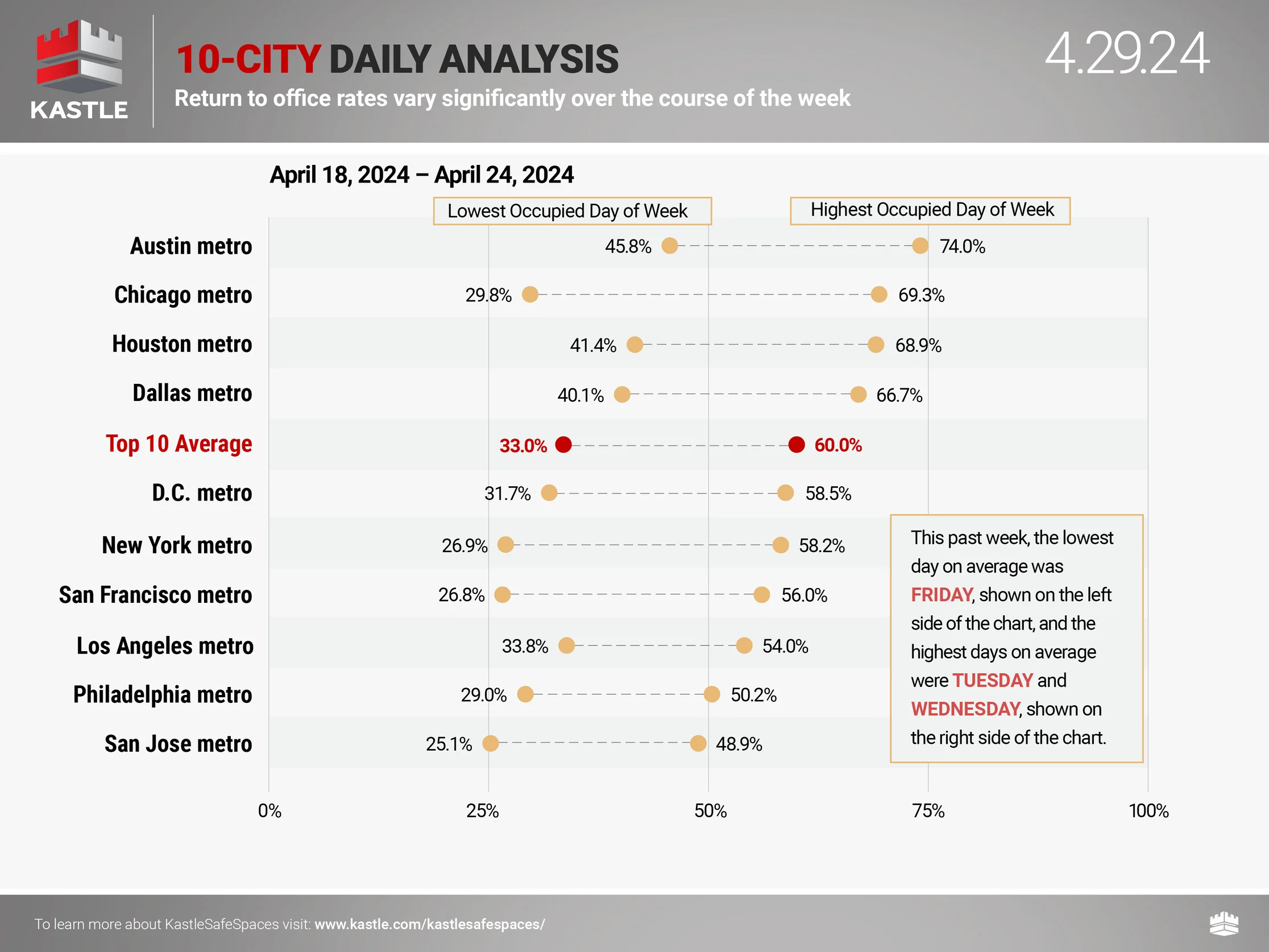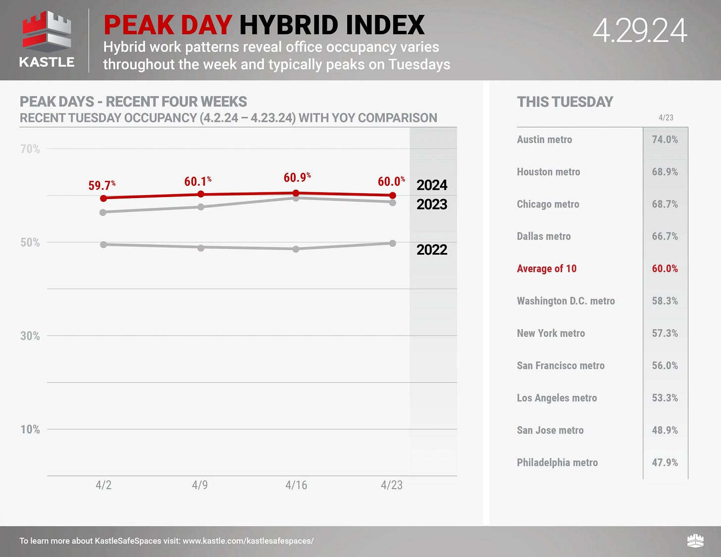 Remember that Kastle charts are overstating occupancy* because their pre-pandemic occupancy benchmark was 100%, which is incorrect (*measures card swipe activity as a proxy for occupancy). Still, they’ve become the standard benchmark for occupancy rates.