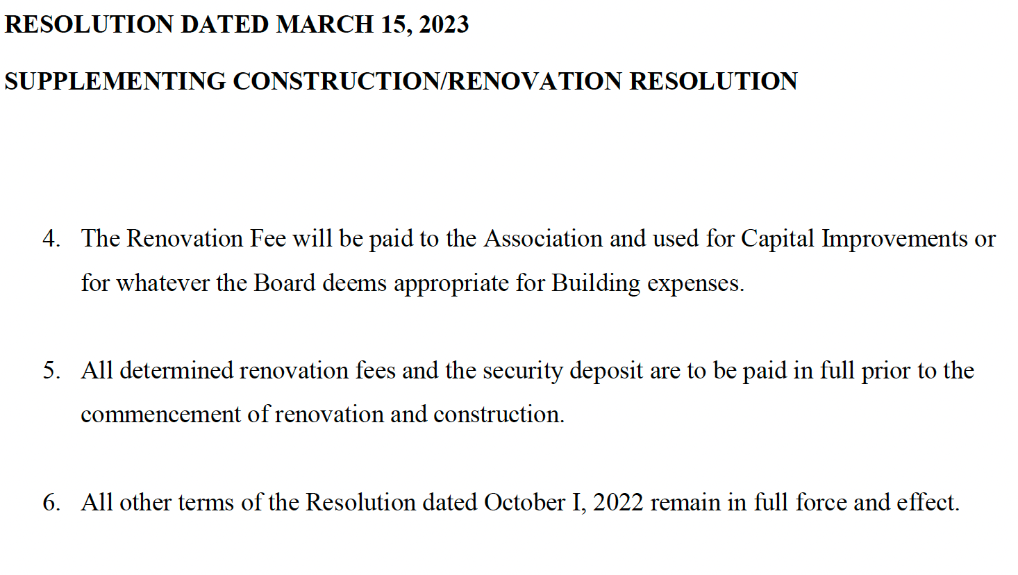 I’m keeping the building address anonymous for now, but clearly, the association is working against its members’ best interests. Renovations influence overall values higher. Look at the cost list when undertaking a renovation. They’re arbitrarily charging an extra $300,000 for a 1,000-square-foot unit on top of the unit owner’s construction cost. That’s absurd. If the address gets out to the market, sales will probably end, and I hope unit owners will sue the association for damages. You can’t add any more damage to market value than this.