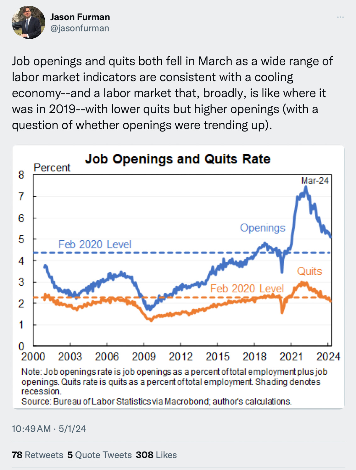 Observers are buzzing that the labor market is cooling, with job openings and quits on the decline, and the Fed Chair says rates are still restrictive. Still, the phrase ‘higher for longer’ makes housing professionals weep. Thankfully, the Fed kept rates steady. My friend Barry Ritholtz has a mega post with charts galore on why the Fed should actually be cutting already.