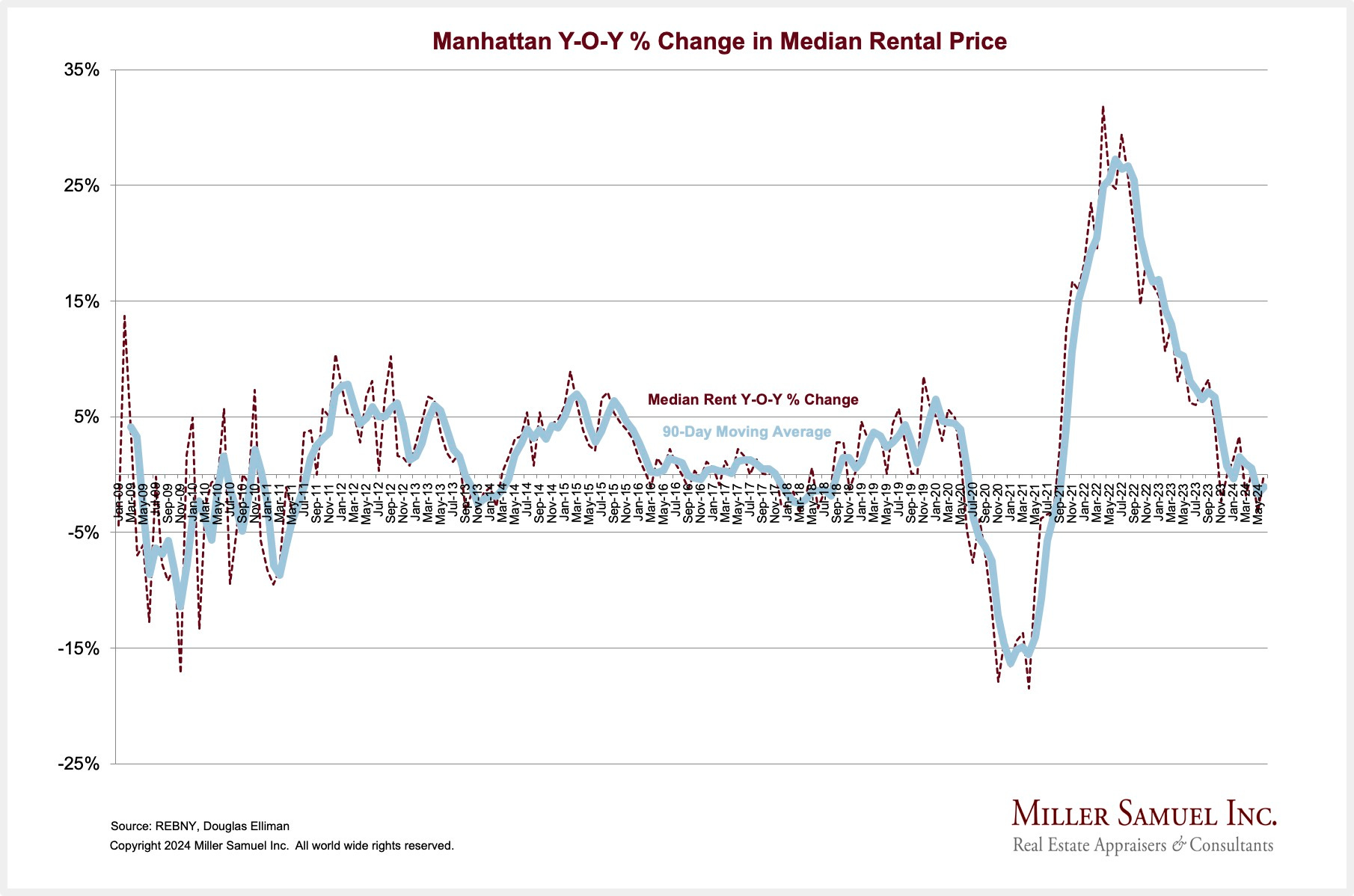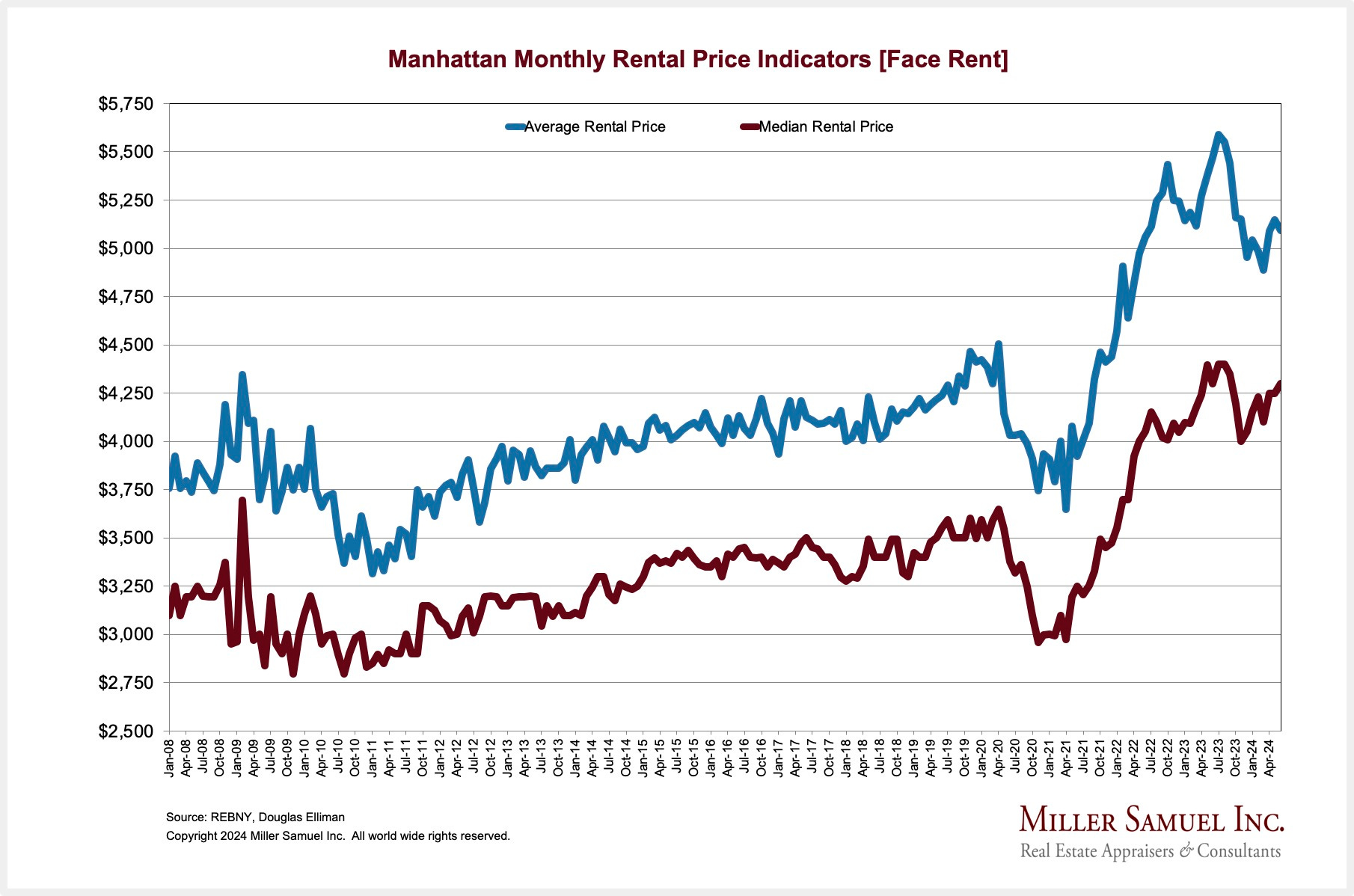 Rents rose nominally month over month in June. Manhattan rents are more than double the national number.