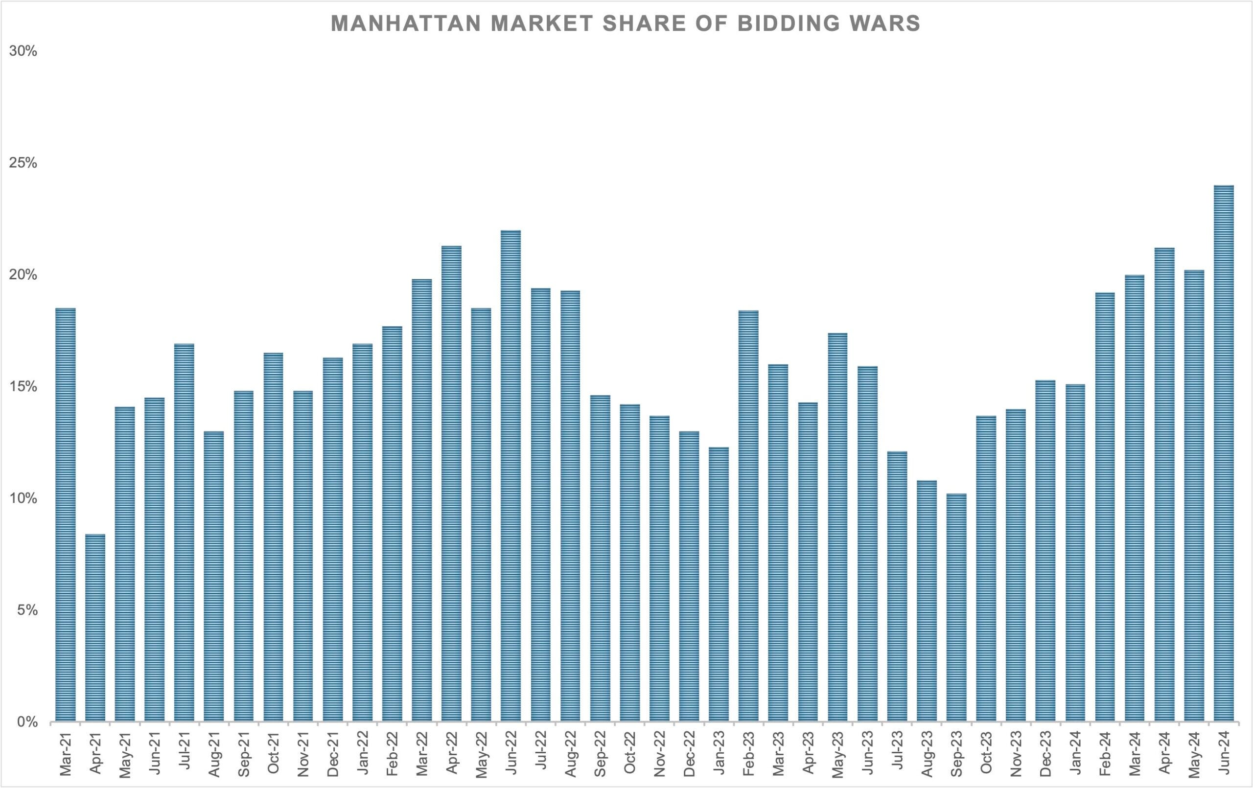 The market share of Manhattan apartments renting for more than the landlord’s ask reached a record 24% in June.