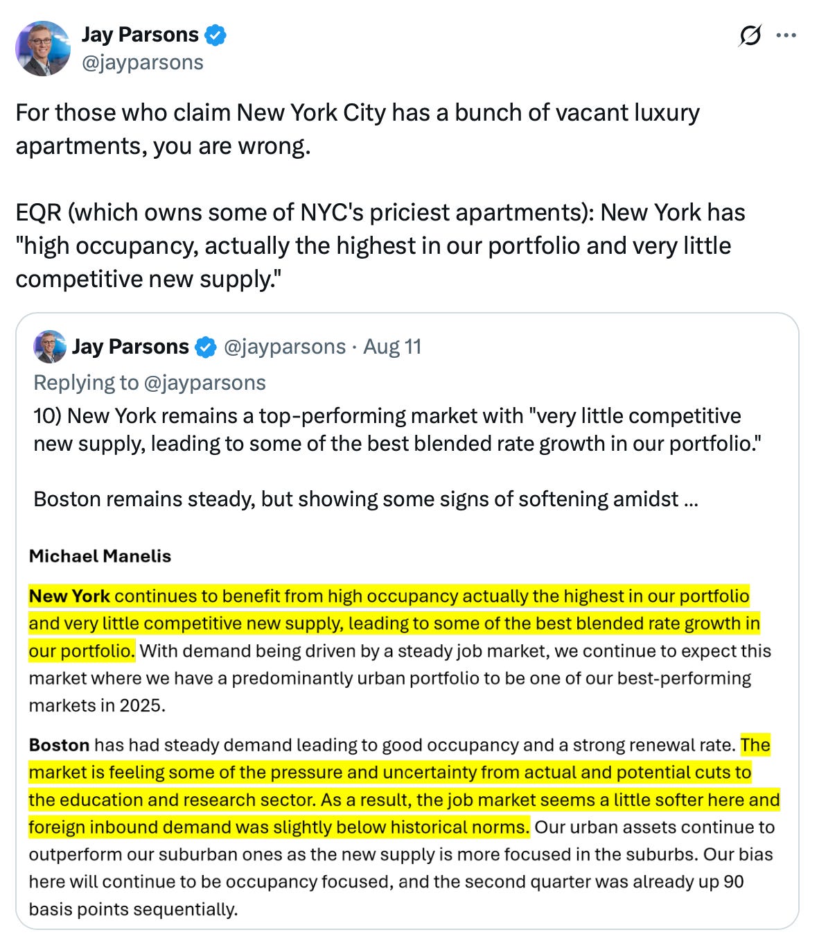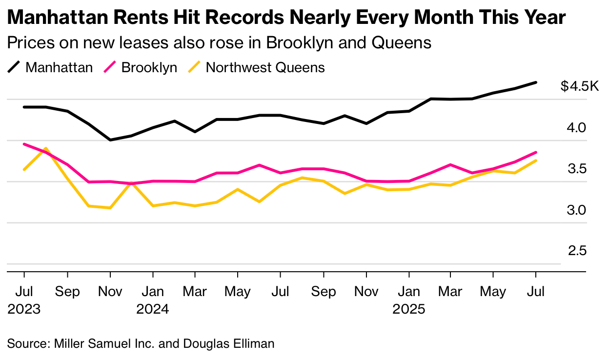 I usually pick the words “mental” or “dental” to rhyme with a “rental” post, but this time I went transcendental. Our NYC rental research was published yesterday, and for rent record enthusiasts [gift link], the results did not disappoint. Rental prices in Manhattan continued to reach new highs, a trend that has become the standard pattern since the beginning of 2025. Median rent has reached a new high in five of the past six months (since February). A monthly rent of $4,700 can get you a 700-square-foot 1-bedroom apartment in a building with an attended lobby and views of the building across the street (and the ability to buy strawberries at 3 am). But with the economy being thrashed by tariff policy, as evidenced by significant downward job report revisions (poor enough to disrupt the narrative of the administration to replace the long-time independent head of stats with someone without experience or professional credibility), the outlook for rental price trends might be weaker this fall if the sales market takes off.