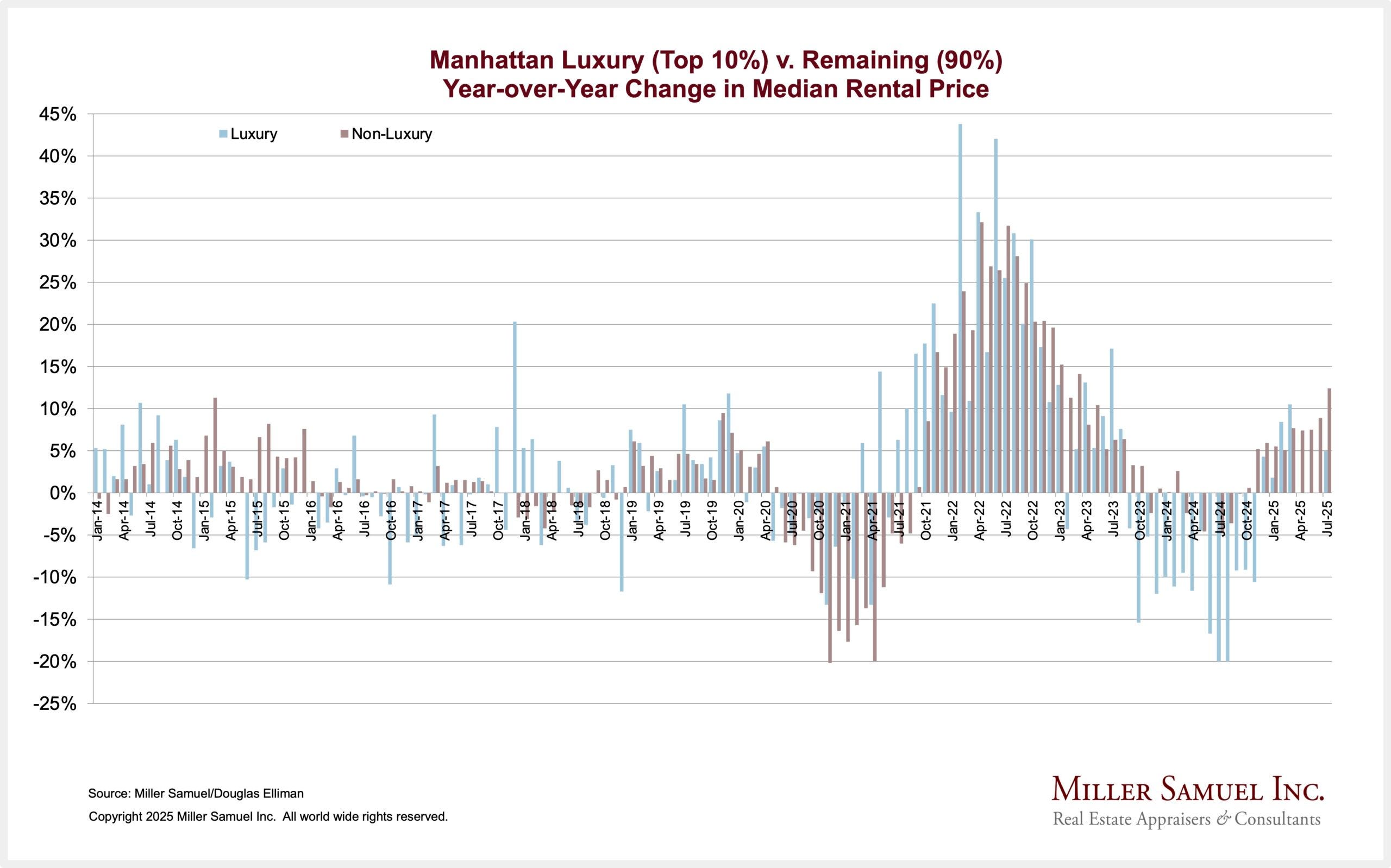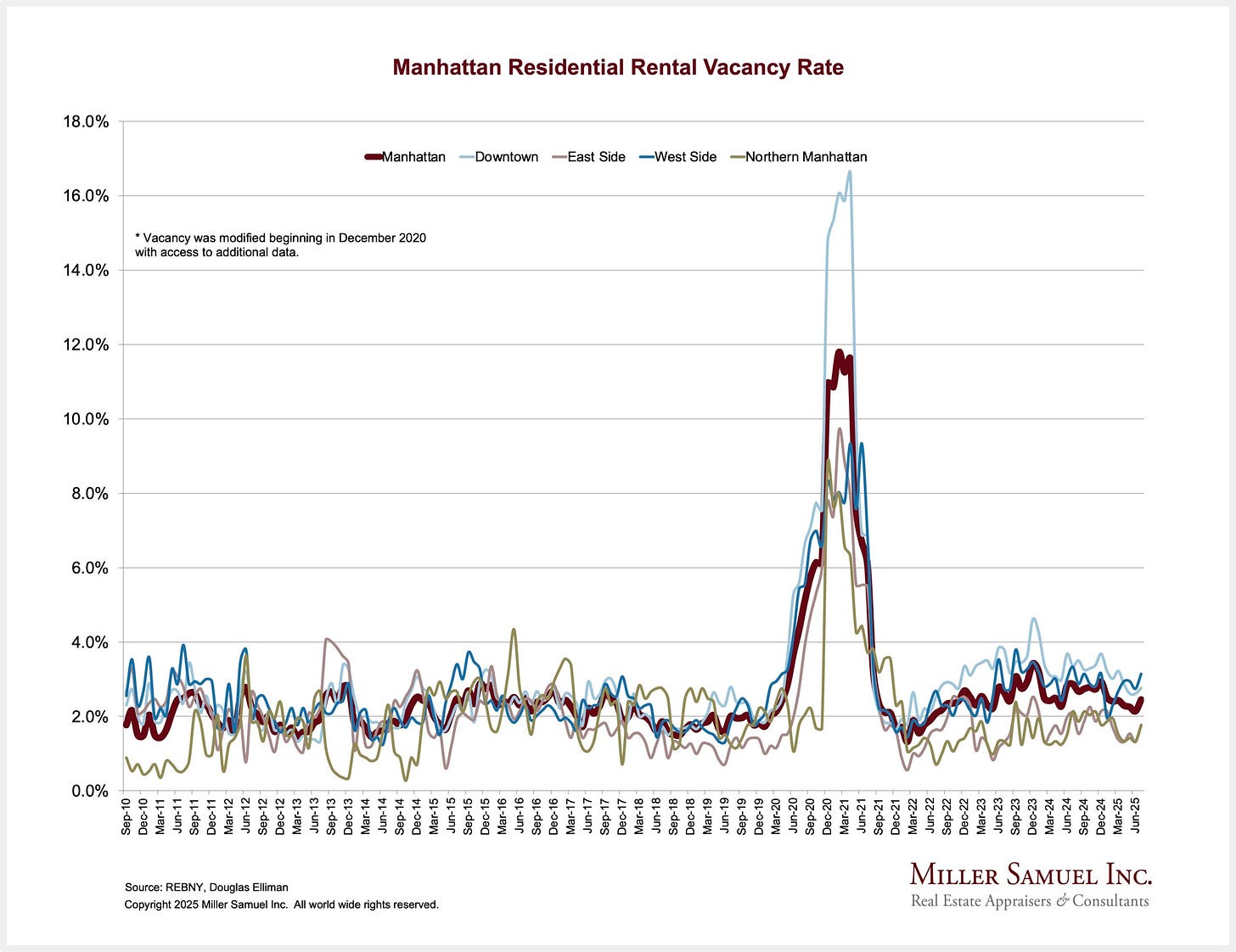 The Manhattan vacancy rate was 2.45% in July, a little lower than the 2.89% decade average for the month. The average for every month over the decade was 2.90%.