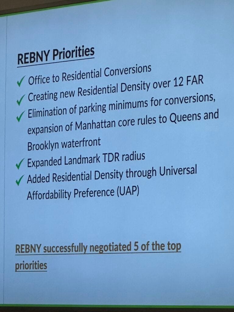 REBNY weathered a tumultuous year for residential real estate and presented the following items (on the image below) as their top accomplishments largely in the form of the City of Yes zoning changes, the first major modification to the NYC zoning resolution of 1961, enabling the development of 82,000 new housing units over the next fifteen years. Admittedly I have not finished reading the document (working on the illustrated version now) yet but I plan to write about it in a future issue of Housing Notes.