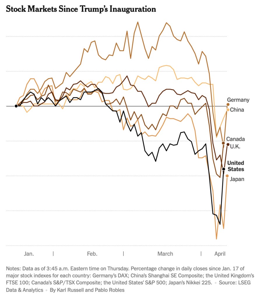 Over the last couple of days, even the uncertainty about the economy has uncertainty. It’s the incredible volatility that is causing the damage; not how much the financial markets may rise or fall in a day. It’s become evident that there is no strategy behind the tariffs other than saber-rattling, and THAT is the issue. We have formerly entered the era of dumb. I had lunch yesterday with some investment sales brokers, and we discussed this very thing. Right after lunch, I got an alert that the tariffs were delayed by 90 days, and the financial markets surged. For all those who think that is a sign that the Tariif Tantrums are good, recognize the the market has already fallen 2.5% this morning as I write this. Incidentally, NASDAQ surged just before the delay announcement was made. Oops. Chaos and anger ensued [free link].
