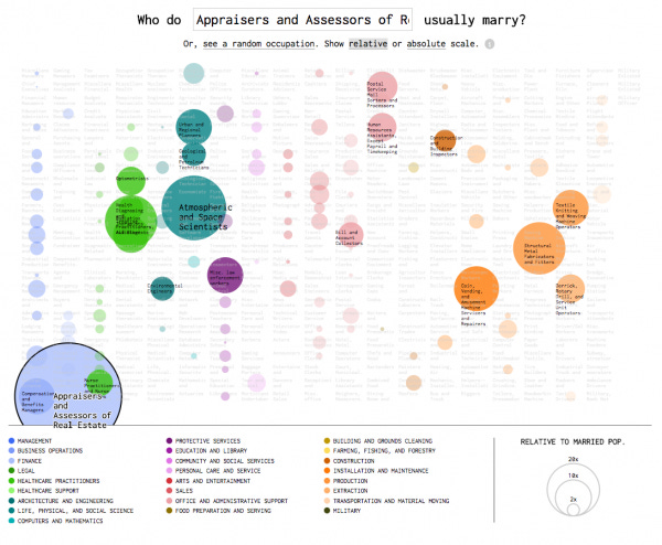 Thankfully my wife of 33 years, who is a certified appraiser, spends her time these days as our CFO, managing comp and health care benefits of our staff among other things. This is a perfect match for me according to a visualization shared on Flowing Data.