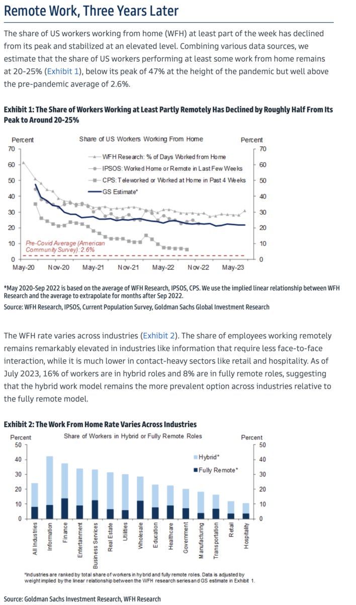 The share of US workers working from home (WFH) at least part of the week has stabilized at around 20-25%, below its peak of 47% at the height of the pandemic but well above the pre-pandemic average of 2.6%.