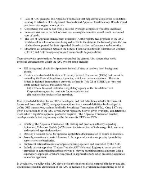 In conclusion, we believe the ASC plays a vital role in the real estate appraisal industry and any