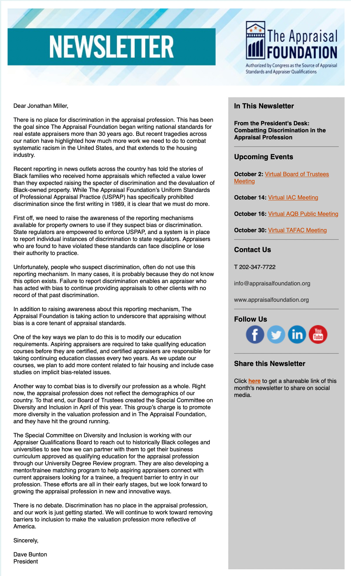 There is no place for discrimination in the appraisal profession. This has been the goal since The Appraisal Foundation began writing national standards for real estate appraisers more than 30 years ago. But recent tragedies across our nation have highlighted how much more work we need to do to combat systematic racism in the United States, and that extends to the housing industry.