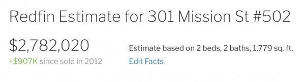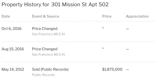 For example, Redfin says that unit 502 at 301 Mission Street (Millennium Tower) closed May 14, 2012, for $1,875,000. It came on the market in 2016 and then was removed after a few price changes.
