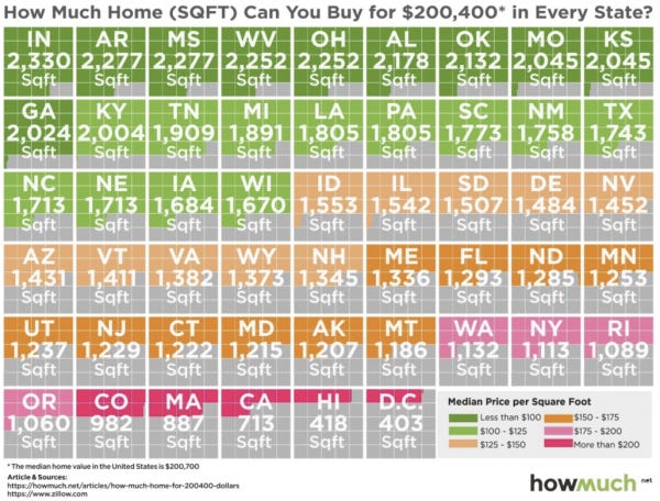 While we all seem to love info graphics and worry about the reliability of Zillow data, I chuckled when I saw the 1,113 average square footage for New York State presented by Howmuch.net. In Manhattan, $200k will get you about 100 square feet of living area, 1 tenth of the statewide average.