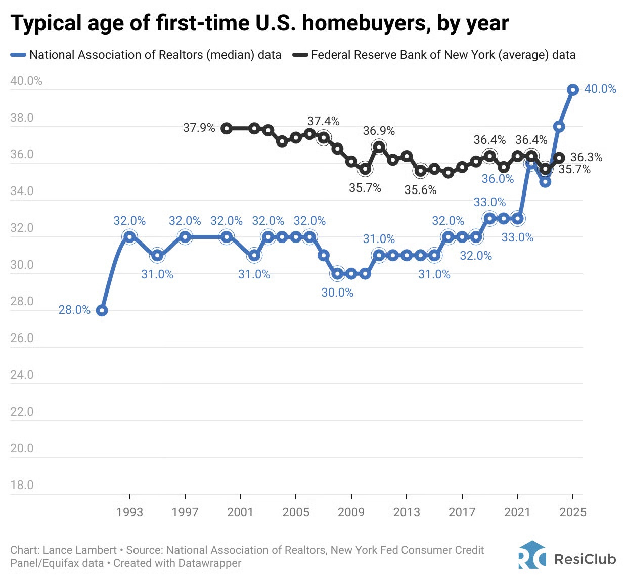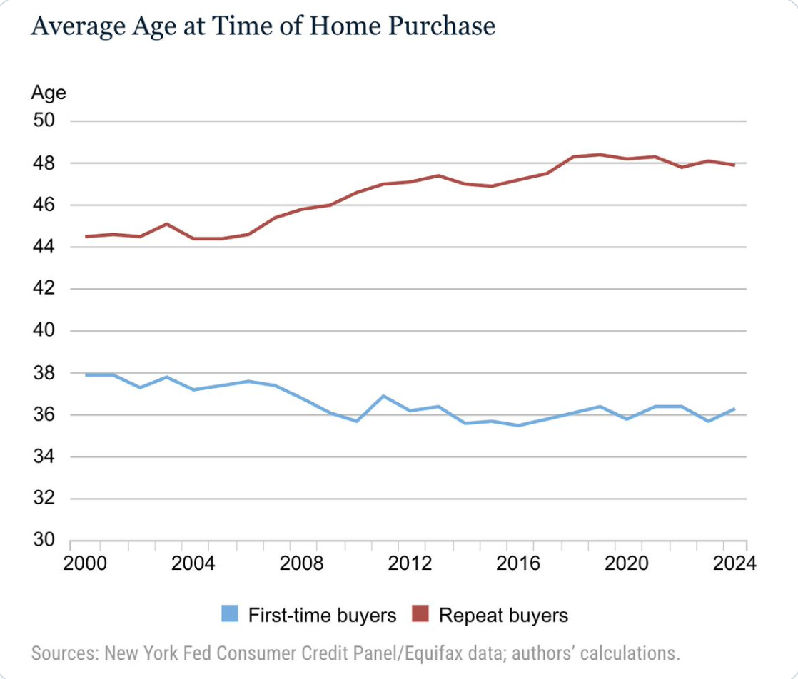 Short Answer? Probably not. The Fed study uses credit data, a larger, actual dataset, while the NAR methodology relies on surveys. The NY Fed reported a median age of 38 for first-time buyers, slightly lower than NAR’s. But if you want to be more confused, instead of median, the average first-time buyer age is around 36 and is DOWN over the past 25 years. First time buyers have not gotten older since 2000!