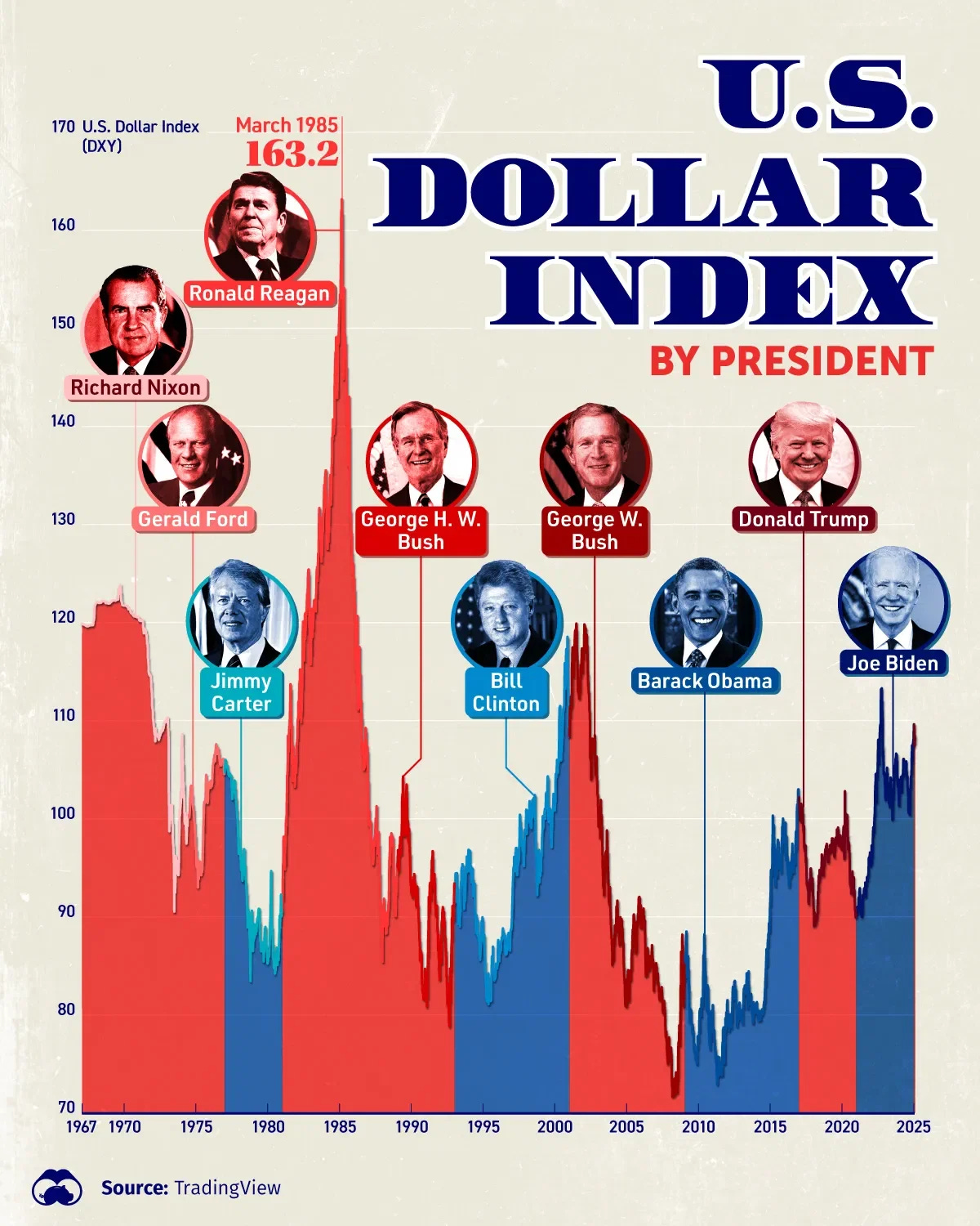 The USD has been rising since 2014 after bottoming from 2006-2014 and is expected to rise further in 2025 due to anticipated tariff policies.