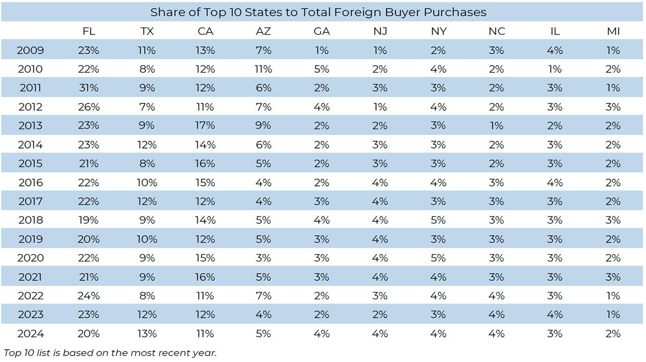 -NAR’s list of top ten states with the highest share of foreign buyer purchases. Florida is the biggest recipient of foreign buyer purchases. Incidentally, I believe NAR has very limited data on Manhattan housing so it surprised me how low their percentages are in the context of the U.S. market (REBNY is not a member of NAR).