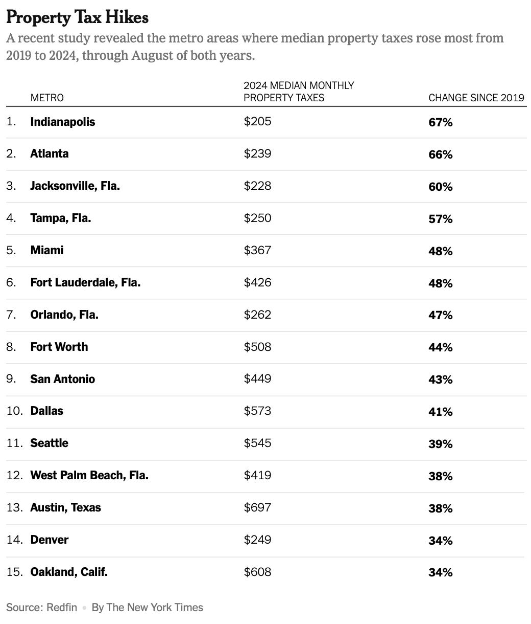 Along with higher mortgage rates and rising insurance costs, property taxes are surging. The Sun Belt is experiencing growing pains reflected in higher costs that came from extra support services needed during the pandemic. Florida and Texas housing are losing some, if not all of their competitive lower-cost advantages through the surge in the construction of new infrastructure to support all the new housing being built. In the following (gift link) New York Times/Redfin table, 10 of the top 15 cities to experience the highest rise in property taxes were located in either Florida or Texas.
