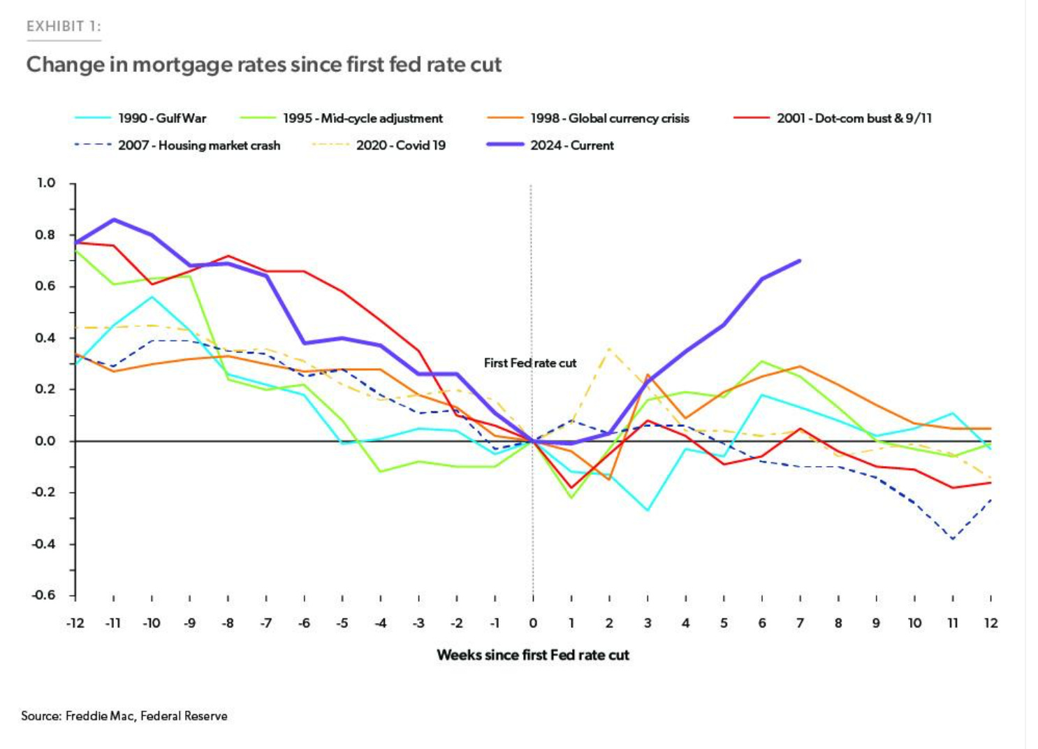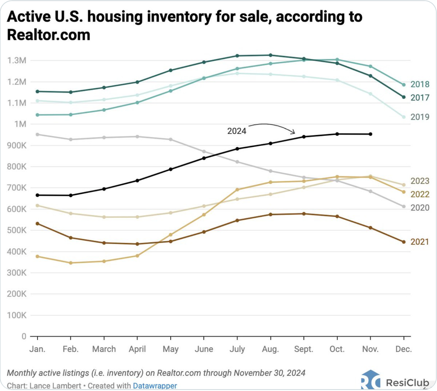 Freddie Mac emphasized listing inventory in their November “Economic, Housing and Mortgage Outlook.” They shared this fascinating chart, showing how much mortgage rates have climbed since the first 50-basis cut in September, inferring a more robust economy is anticipated in 2025.