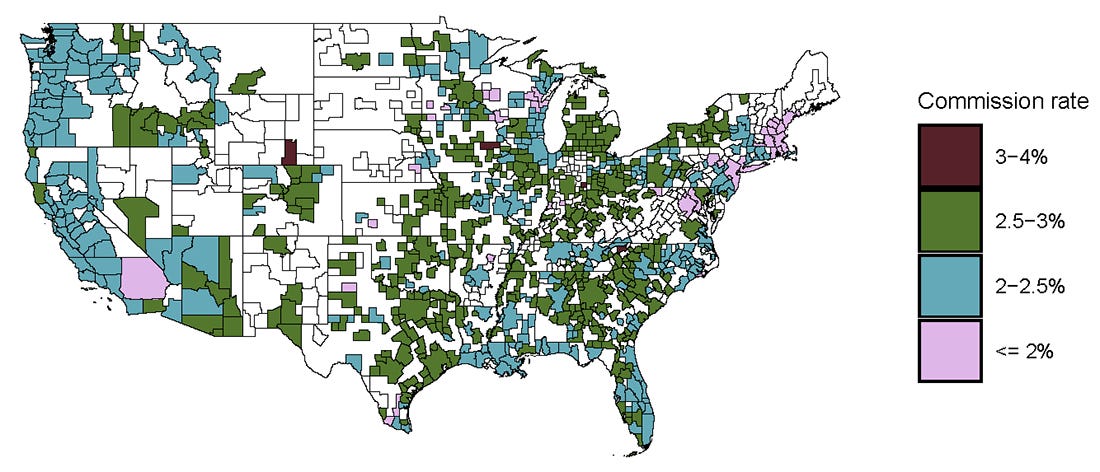 The following map from the Fed study illustrates commission rates back in 2022, before the 2024 NAR settlement. These commissions represent the “sides” of a transaction, buy-side and sell-side agents, in the language of the real estate brokerage industry.