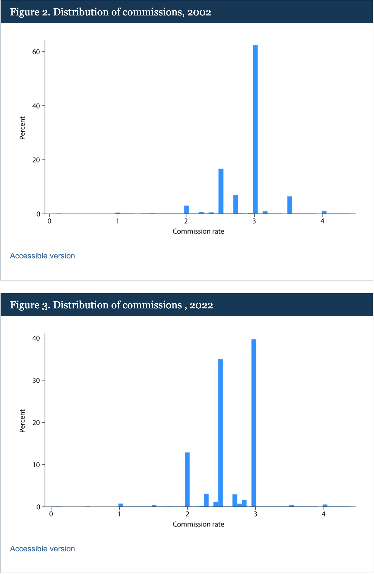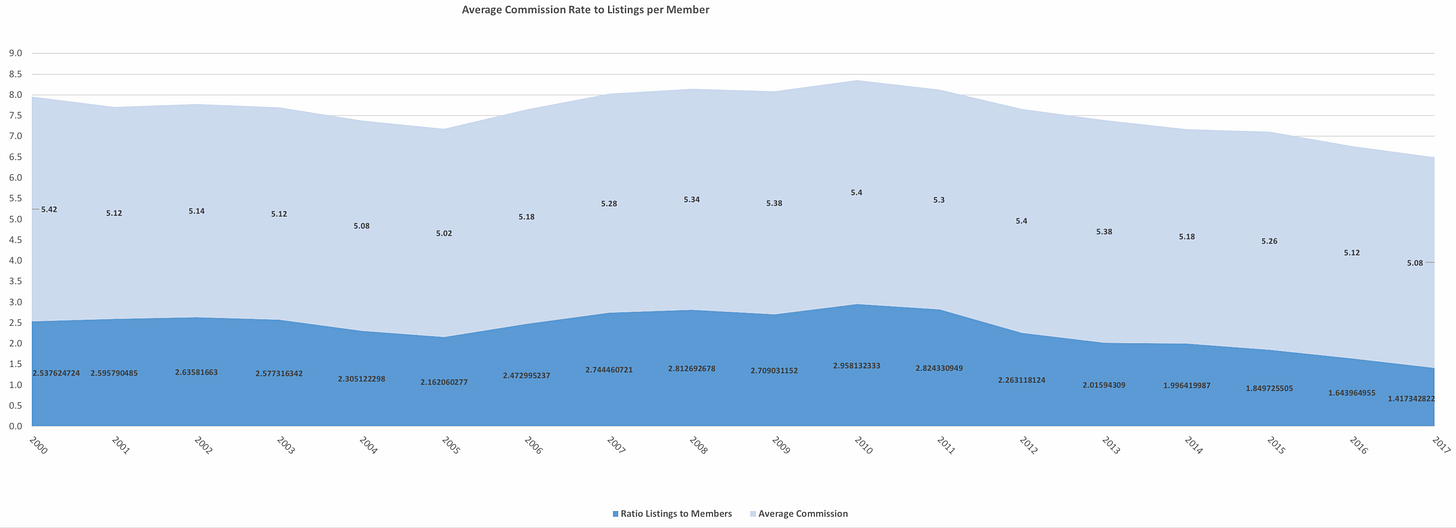 The following two charts show how commissions as a percentage have declined over time (because prices are rising).