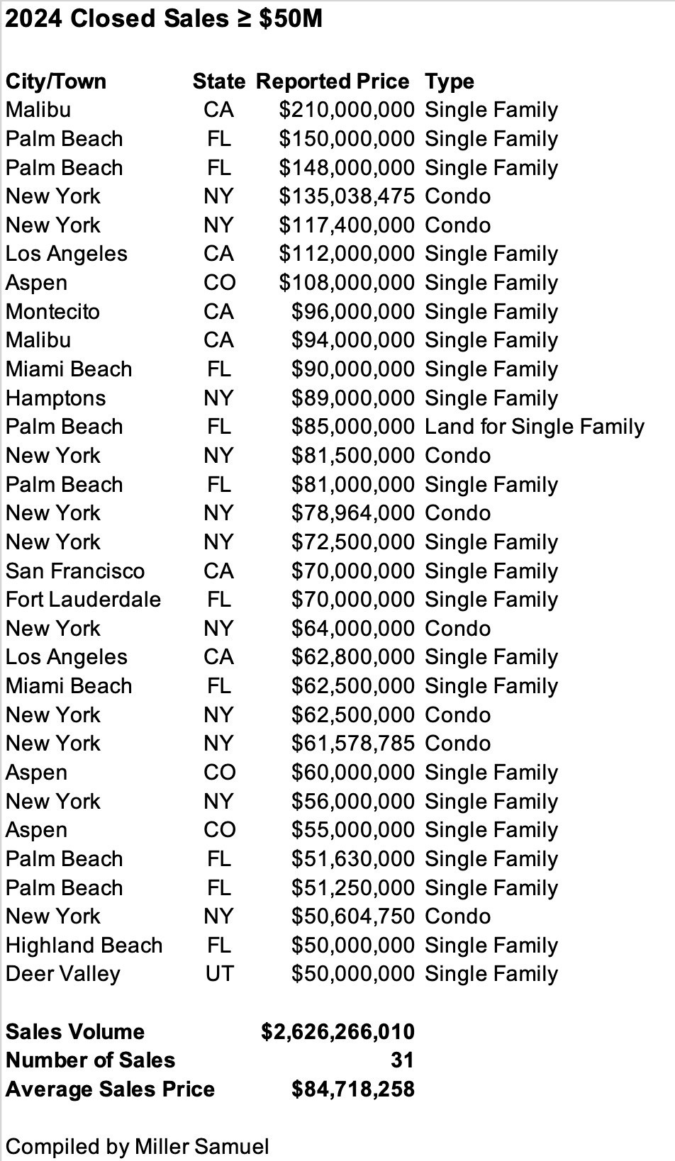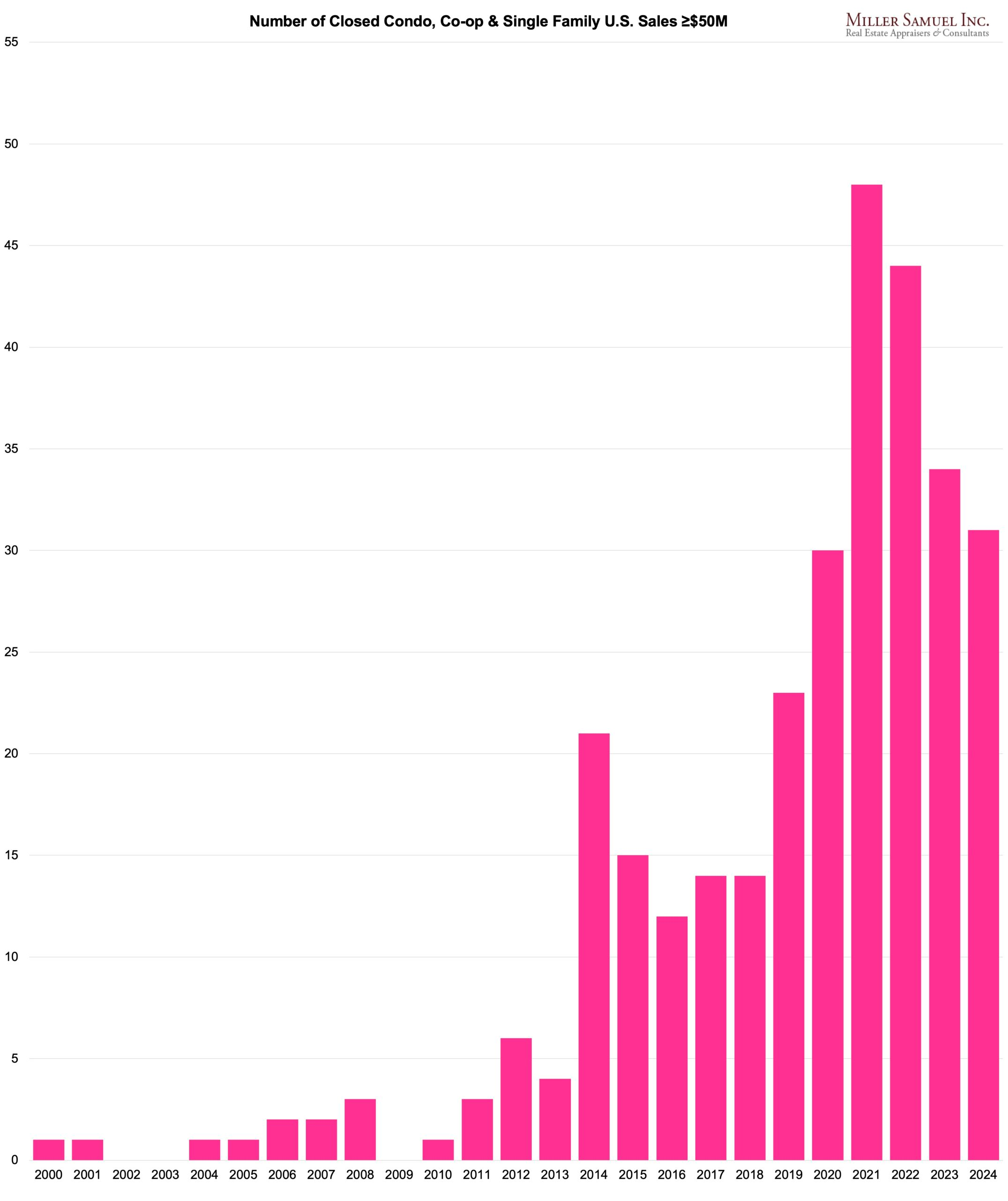 I’ve often said that we as a society are way too obsessed with the uber-wealthy, assuming that they figured out life and we mere mortals haven’t been able to. Yet their purchase behavior in the housing market is still worth following. It is always important to note that these sales have little if nothing to do with the performance of the local housing market but are a distinct submarket and, therefore, worth tracking. They are a collection of one-offs that define a national or a global market. The 2024 U.S. total of sales at or above the $50 million threshold was the fourth highest in history, and the $100 million sales total was the second highest in history. The price averages in aggregate for 2024 continued to rise.
