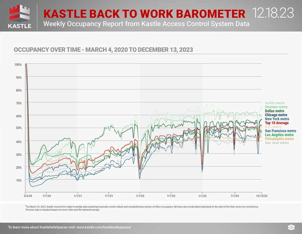 Remember that Kastle charts are overstating occupancy* because their pre-pandemic occupancy benchmark was 100%, which is incorrect (*measures card swipe activity as a proxy for occupancy). Still, they’ve become the standard benchmark for occupancy rates.