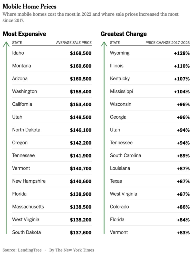 The New York Times has an interesting piece on mobile home price trends, which tended to outpace the price trends of mobile homes. The report’s author didn’t have a firm answer as to why this happened other than it being a micro niche market. The quote from the piece is precisely what I learned when I spoke at MFI, making the price surge even harder to understand.