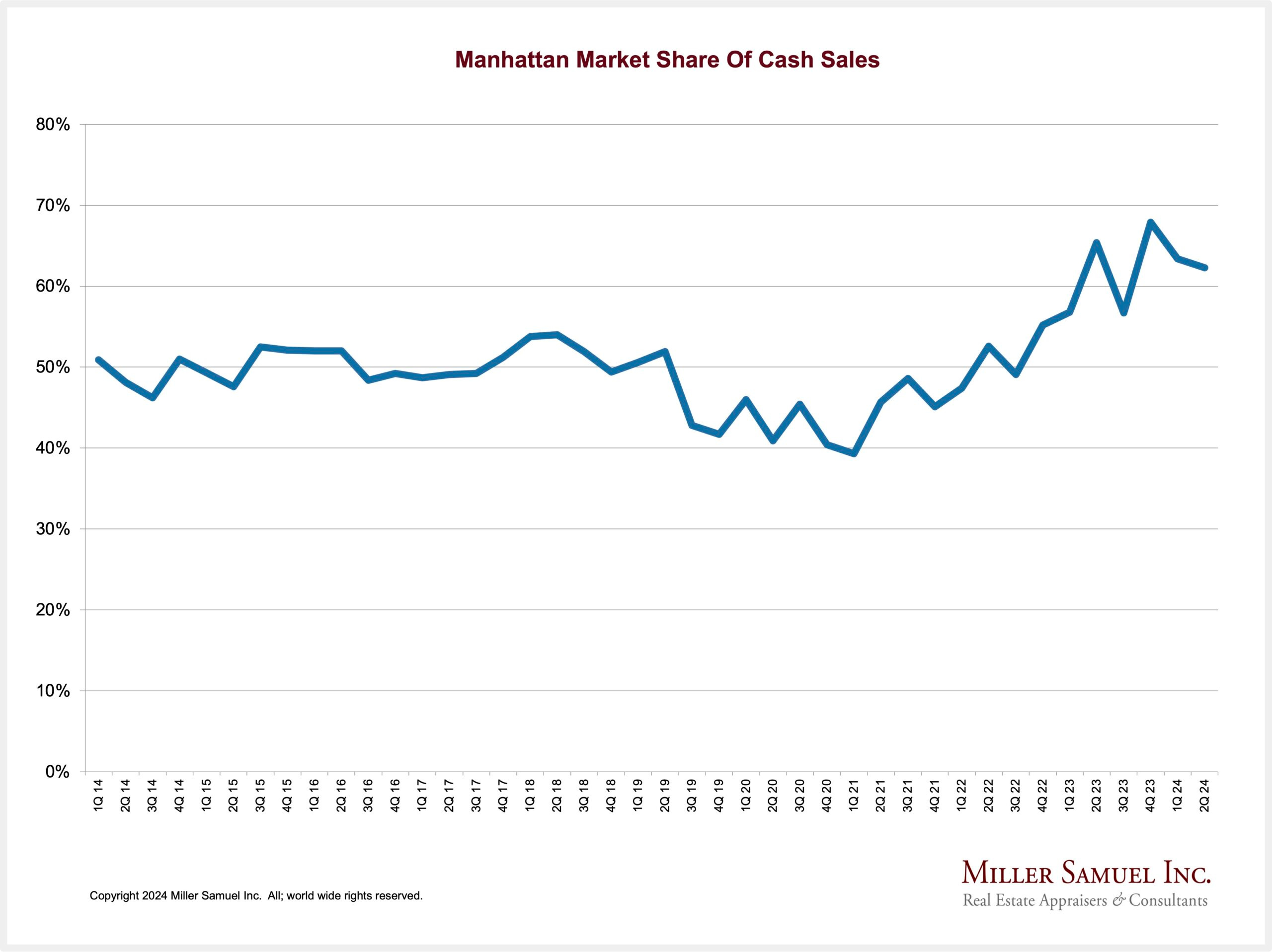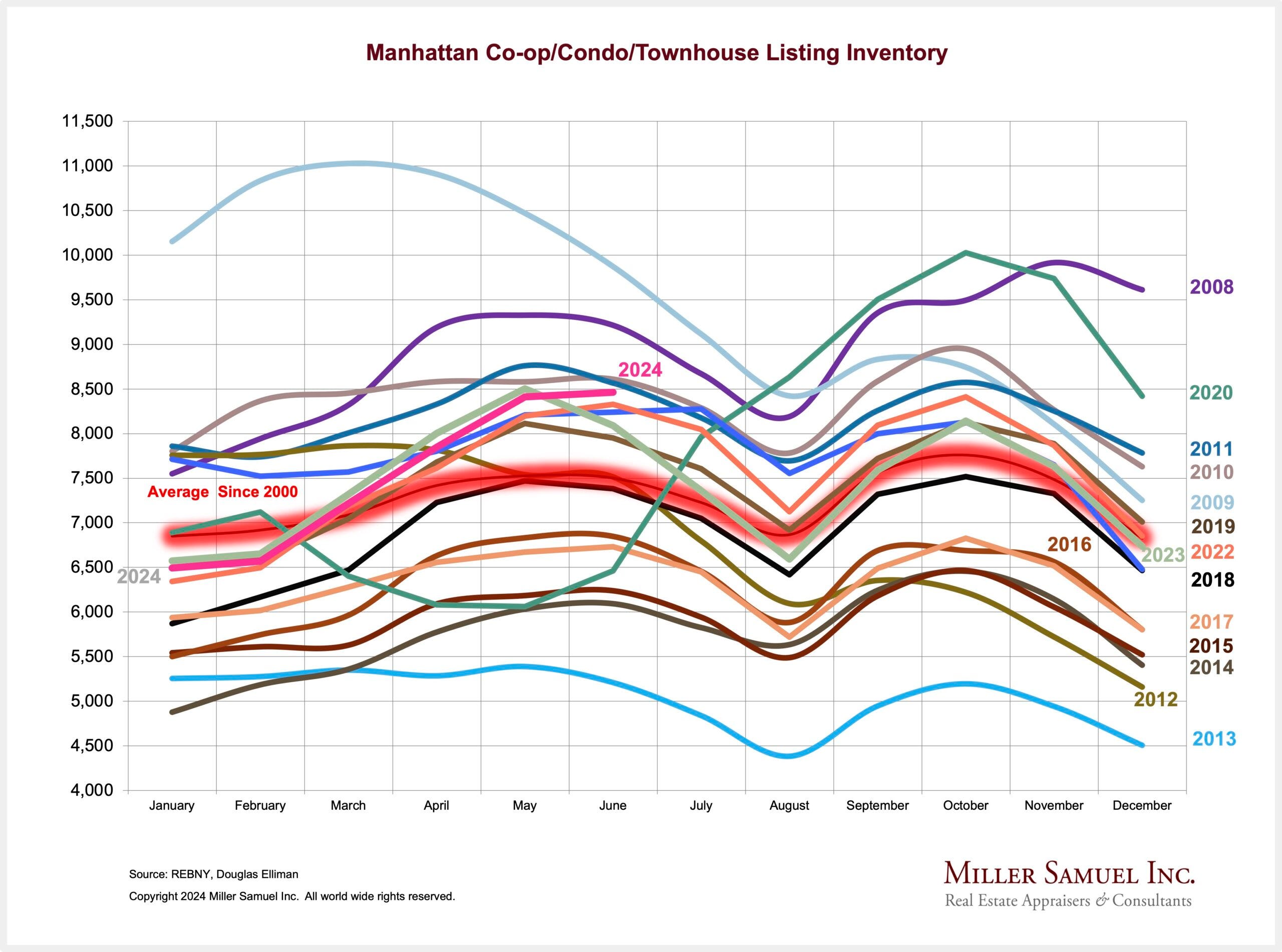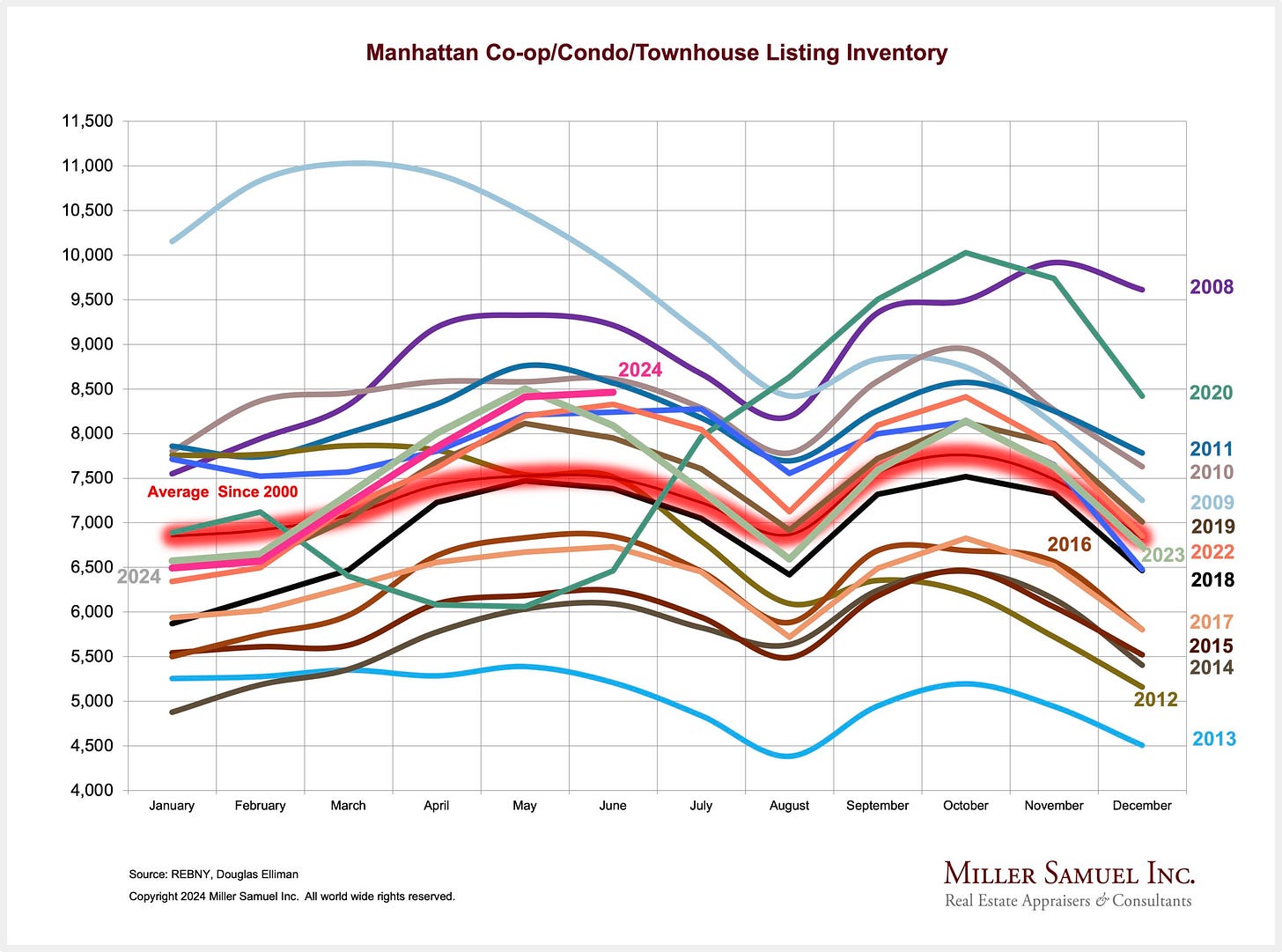 In our quite busy Manhattan listings chart, 2024 is above the long-term average which has helped play a role in more sales to occur in Q2-2024. Supply isn’t bloated but it is indeed on the high side when compared to the average since 2000 and more favorable to buyers.