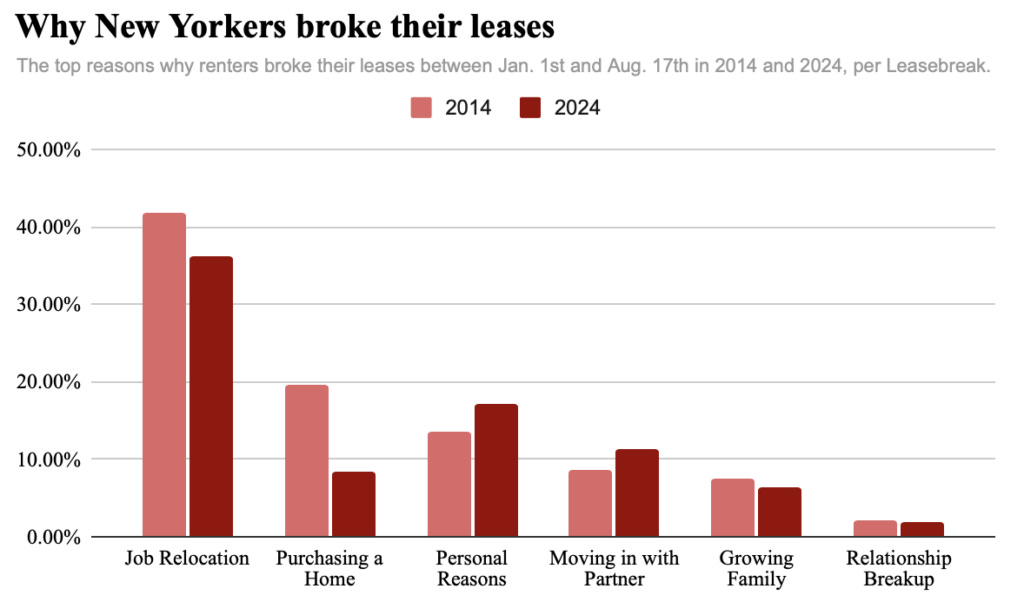 Brick Underground has a great piece on why NYC renters break their leases using data from Leasebreak. This pattern doesn’t quite compute for me unless I think of the renters in two different ways: on the fence about purchasing and as perpetual renters, of which the latter is a much larger group. Those renters who are camping out in the rental market until they are ready to buy were the cohort that made a tight rental market a lot tighter.