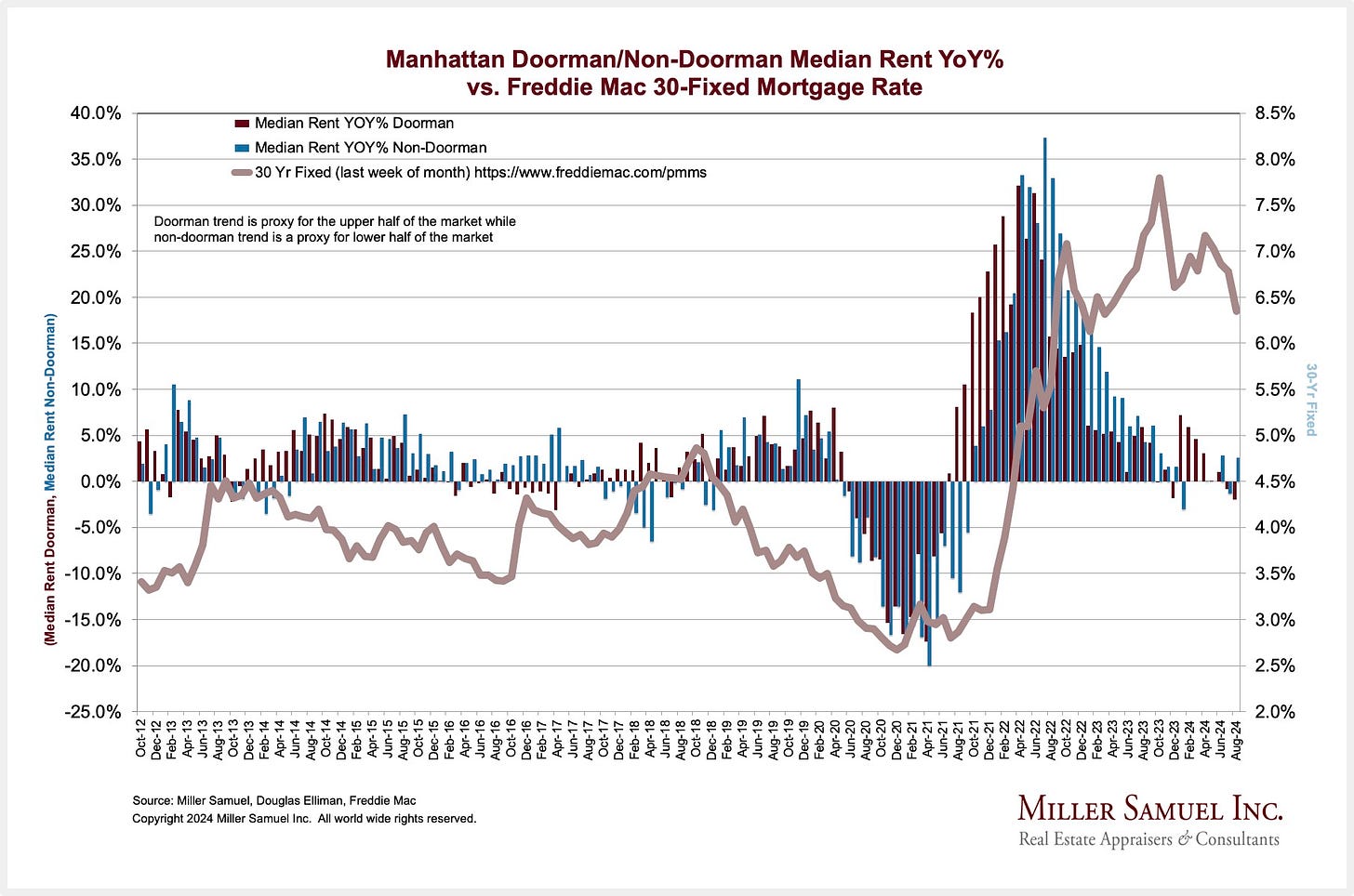 Last week, our August new signed contract reports were published, and they showed a year-over-year surge of 30.3% in Manhattan and 94.8% in Brooklyn, likely reflecting the anticipation of imminent rate cuts. U.S. rents remain elevated, but growth is slowing. Consumers expect mortgage rates to continue to fall, especially with the anticipated Fed cuts in September, November, and December. This is a new wrinkle on future expectations that didn’t exist in July. The largely symbolic improvement in affordability after 2.5 years of waiting should shift some excess demand from the rental market to the purchase market.
