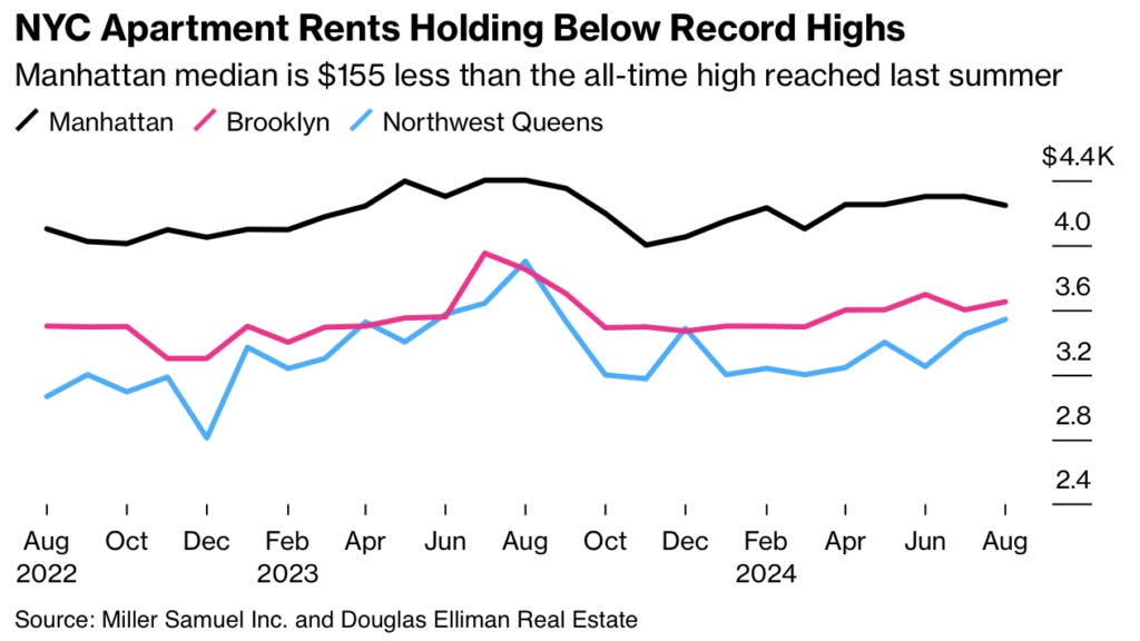 “In Manhattan, new leases were signed at a median of $4,245, down 3.5% from the previous August, when costs were at an all-time high, according to appraiser Miller Samuel Inc. and brokerage Douglas Elliman Real Estate. Median prices also fell annually in Brooklyn and Queens.”