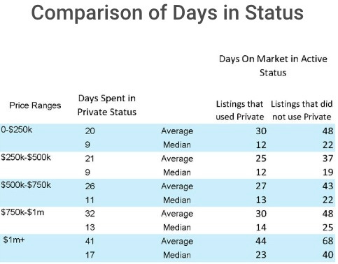 The agents can keep their listings private indefinitely and do not accrue Days on Market; after public marketing begins, they must transition to standard MLS status.