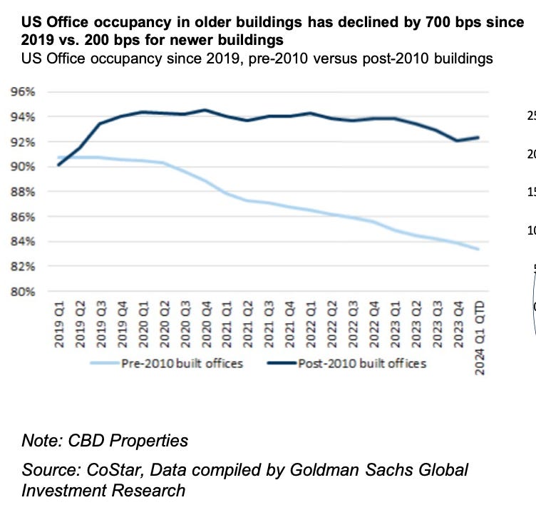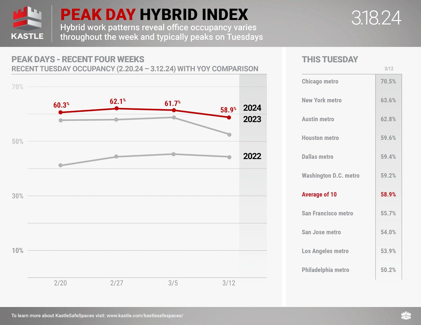 Remember that Kastle charts are overstating occupancy* because their pre-pandemic occupancy benchmark was 100%, which is incorrect (*measures card swipe activity as a proxy for occupancy). Still, they’ve become the standard benchmark for occupancy rates.