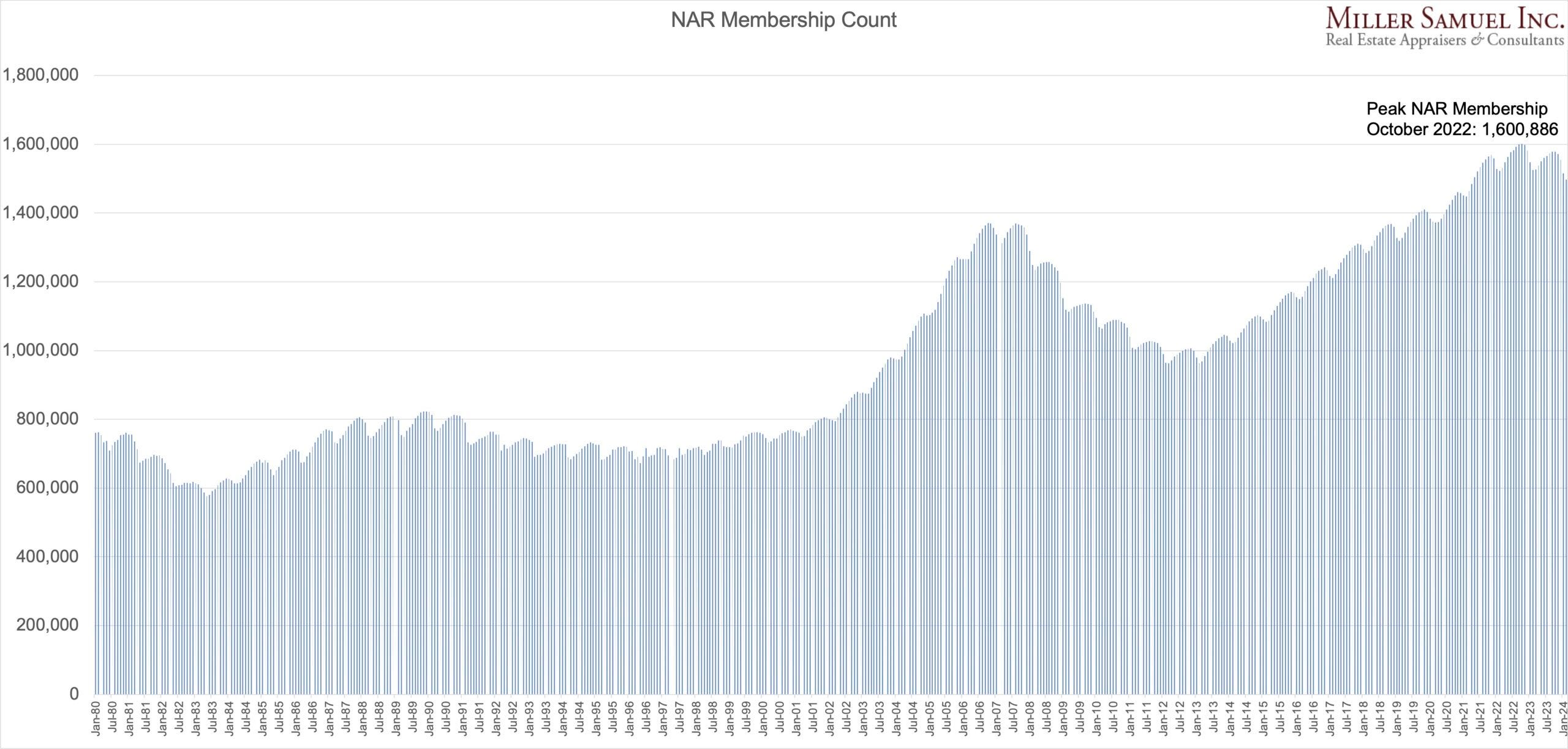 The purpose of NAR’s landmark settlement was to decouple the commissions paid by the seller from the buyer’s agent. After all, sellers don’t hire the buyer’s agent, nor does the buyer’s agent act in the seller’s best interests. The settlement means that users of representation services must pay for those services. In a traditional deal structure, the listing agent was usually paid 6% and gave 3% to the buyer’s agent. Now, the buyer could end up paying the buyer’s agent directly. NAR’s membership peaked at 1.6M+ in October 2022 and is down 6.5% through February 2024; much is due to lower sales volume in a 100% commission world. Now that membership is no longer required, I expect the trade group’s membership to collapse in a few years.