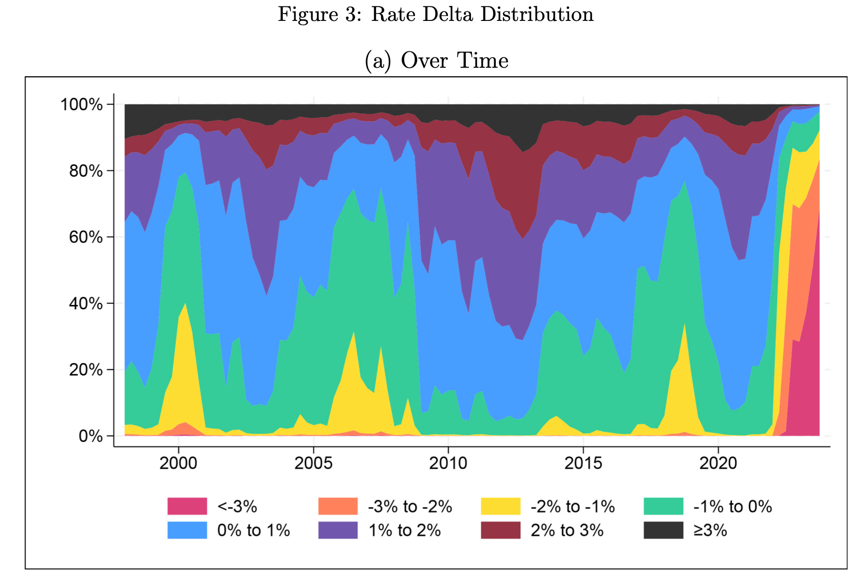 The FHFA is the regulator responsible for the GSEs, Fannie and Freddie, and they published a paper this week: Working Paper 24-03: The Lock-In Effect of Rising Mortgage Rates. As the spread between their pandemic mortgage rate and the prevailing mortgage rate expands, the probability of home sales falls. They found that: